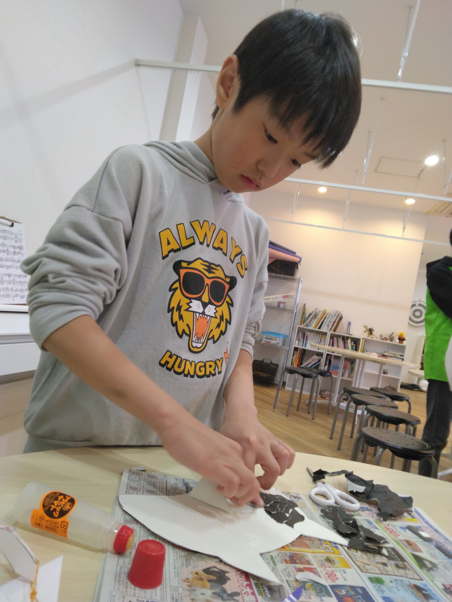 三年生の女の子が先生になって、節分用の三方を作ったり、鬼のお面を仕上げているお友だちもいましたよ。