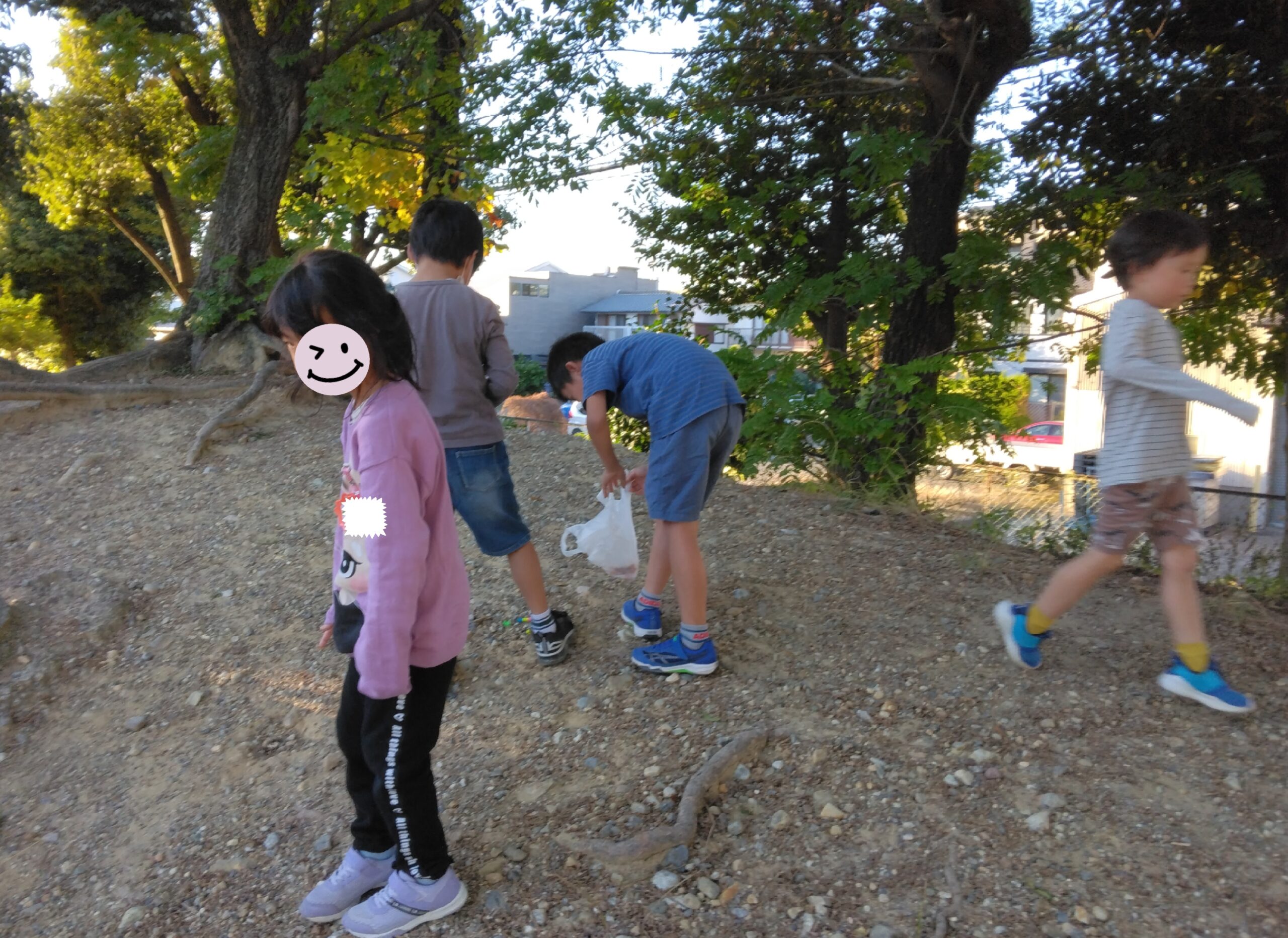 今日は松ぼっくりやドングリを使って工作をしてみようと言う事で、おやつを食べたあとで花の木公園に行きました。
