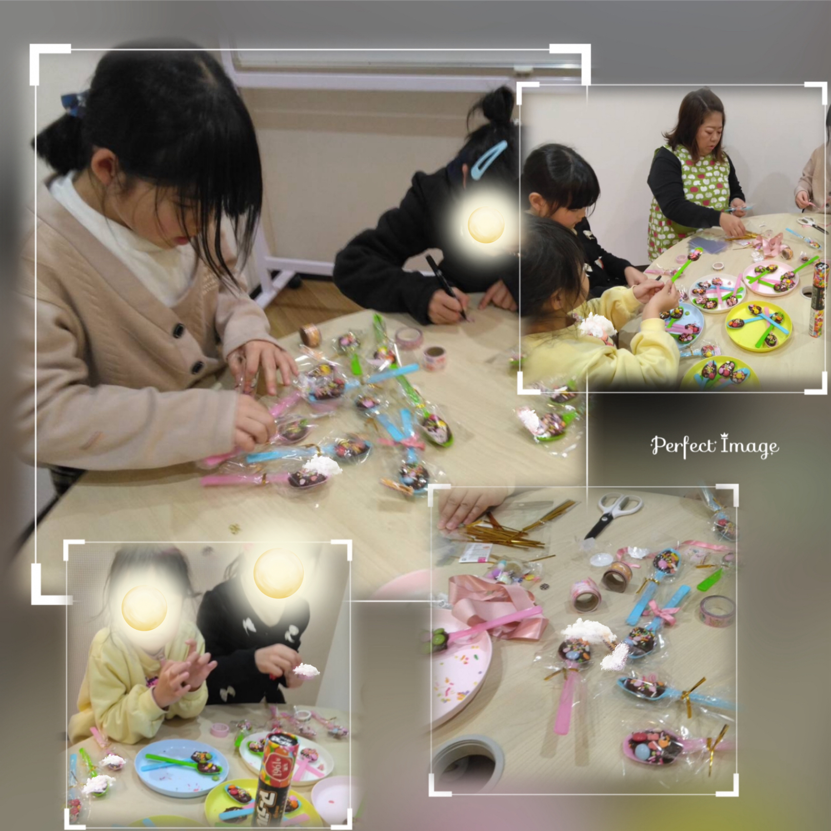 チョコレートの溶ける甘い香りの中、女の子達は先生がスプーンに乗せてくれたガナッシュチョコの上にチョコスプレーやマーブルチョコを可愛くトッピング!
