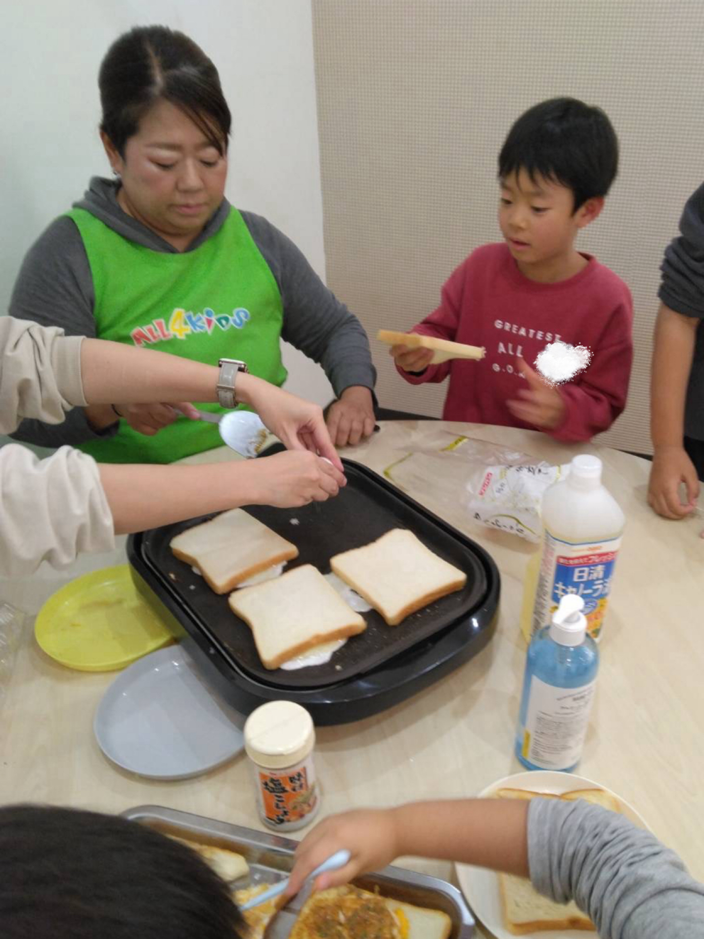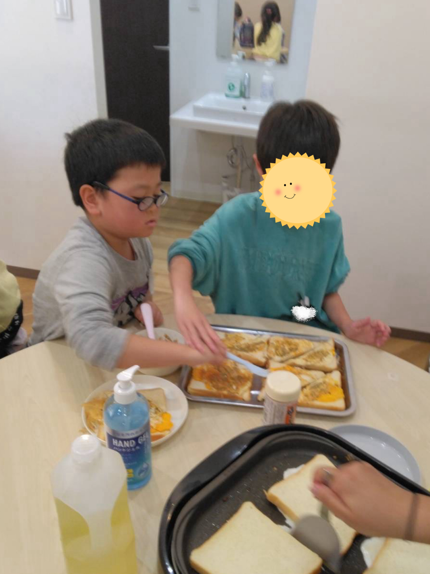 こちらのお友だちはパンをわたしてくれたり、ソースを塗るお手伝いをしてくれています😊