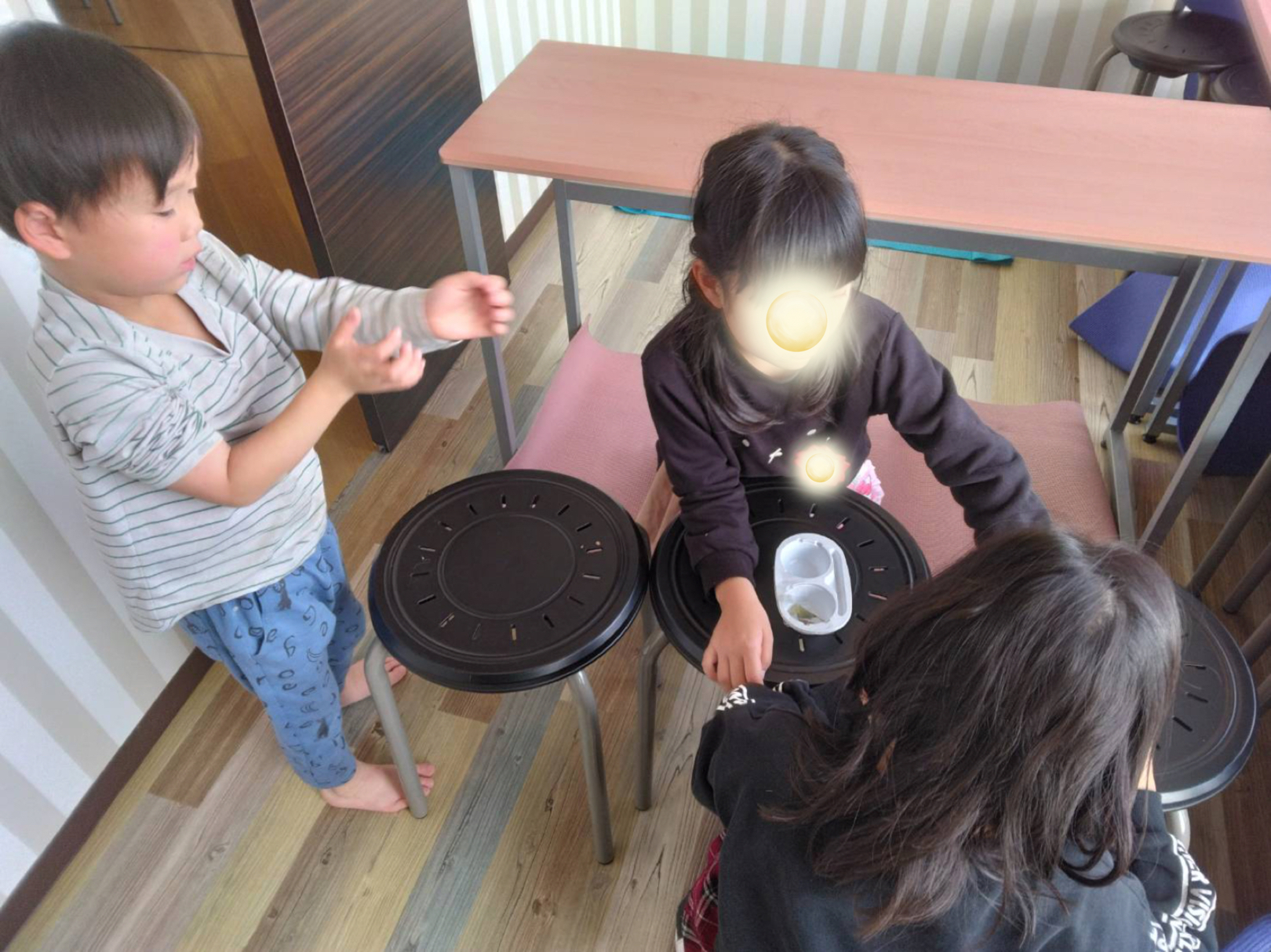 おやつ前に、何かをしていた女の子たち。