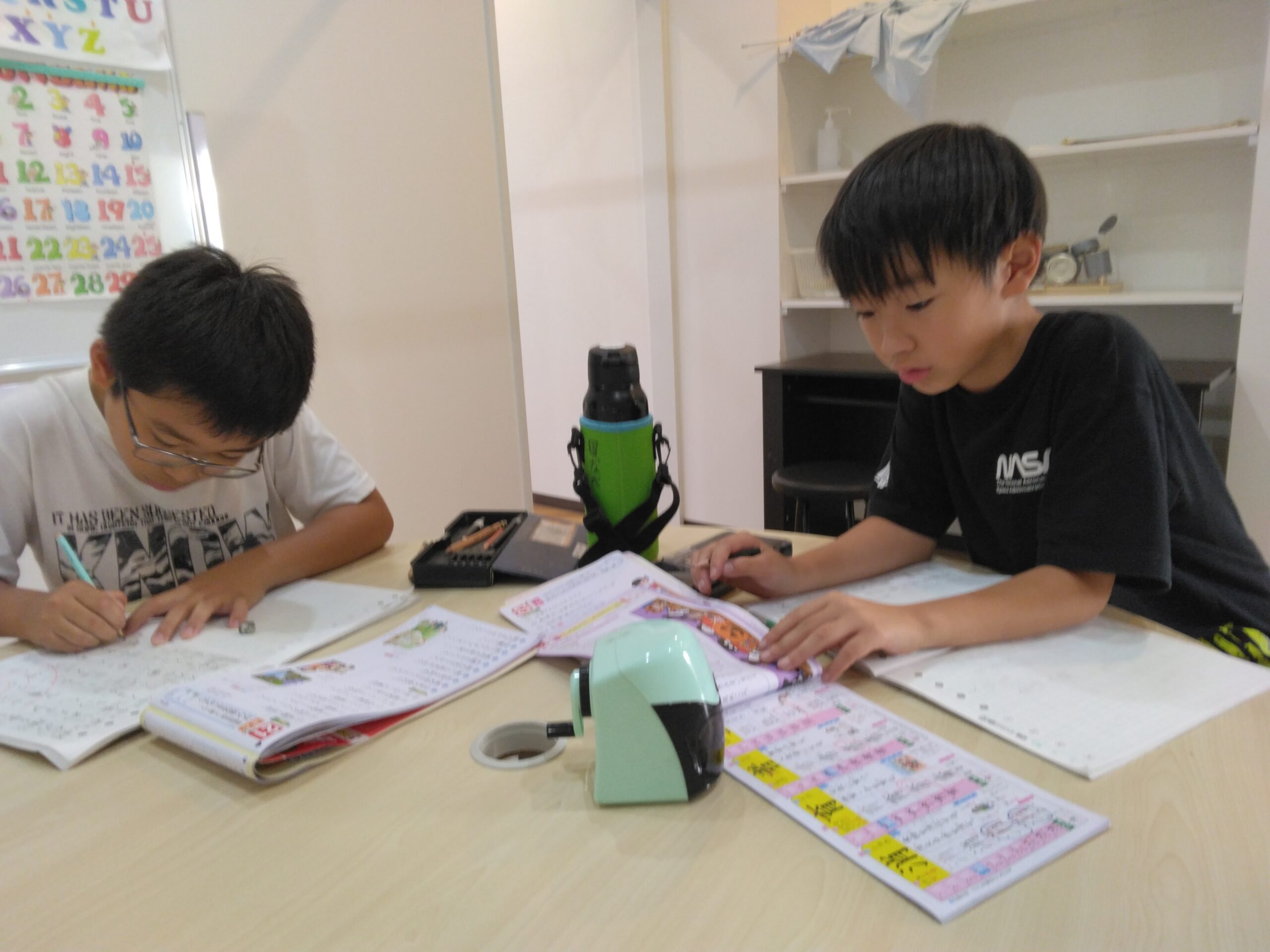 宿題をしていても、今日の活動が気になる男の子たちです。