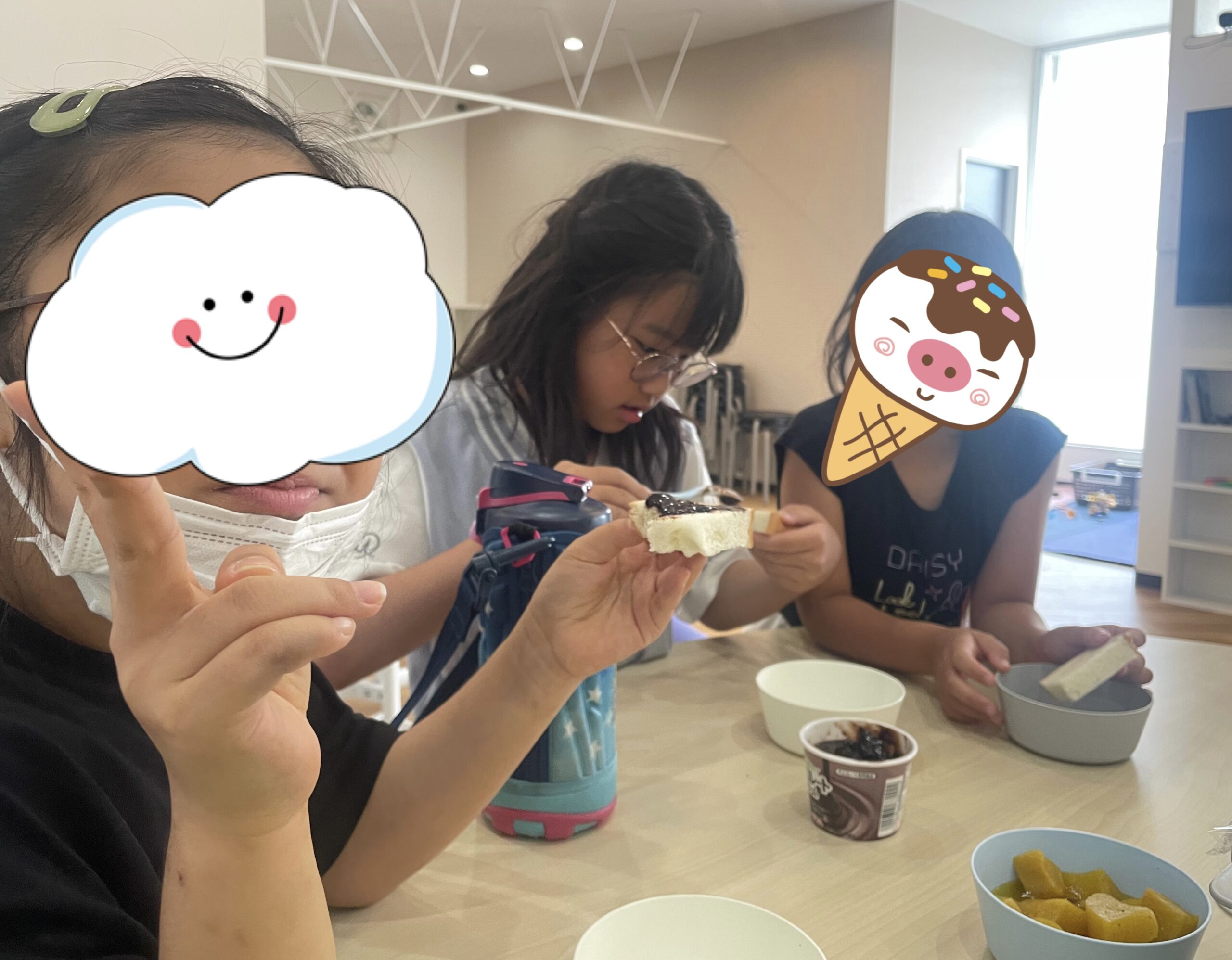 今日のアフタースクールのおやつは……パンに好きなジャムやチョコレートクリーム、バターやメープルシロップなどを付けて食べることにしましたよ!