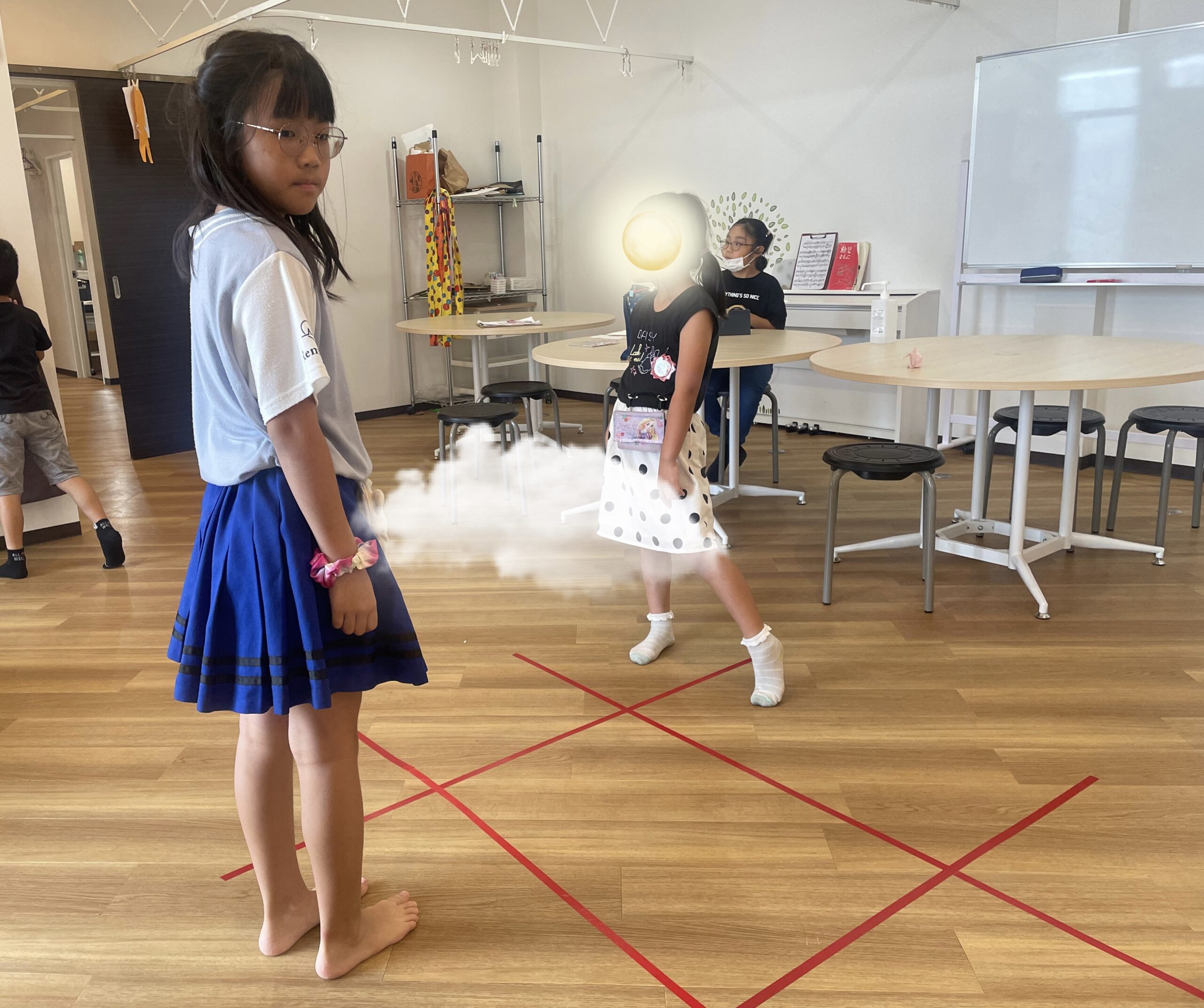 その後は、昨日外で遊んだ『9マス鬼ごっこ』がまたやりたい!!とのことで、今度はお部屋にビニールテープで線を作り始めることにしました。