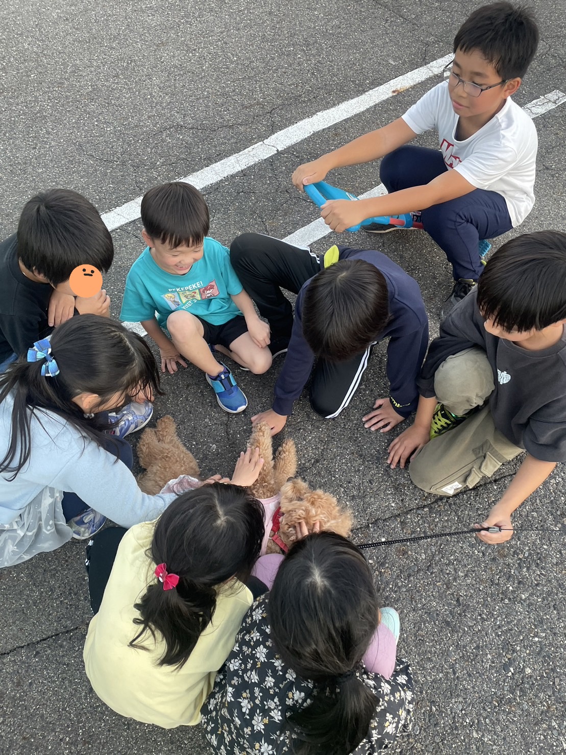 外遊びの最中にカワイイ小犬が遊びに寄ってくれて、子供たちも大喜びです!