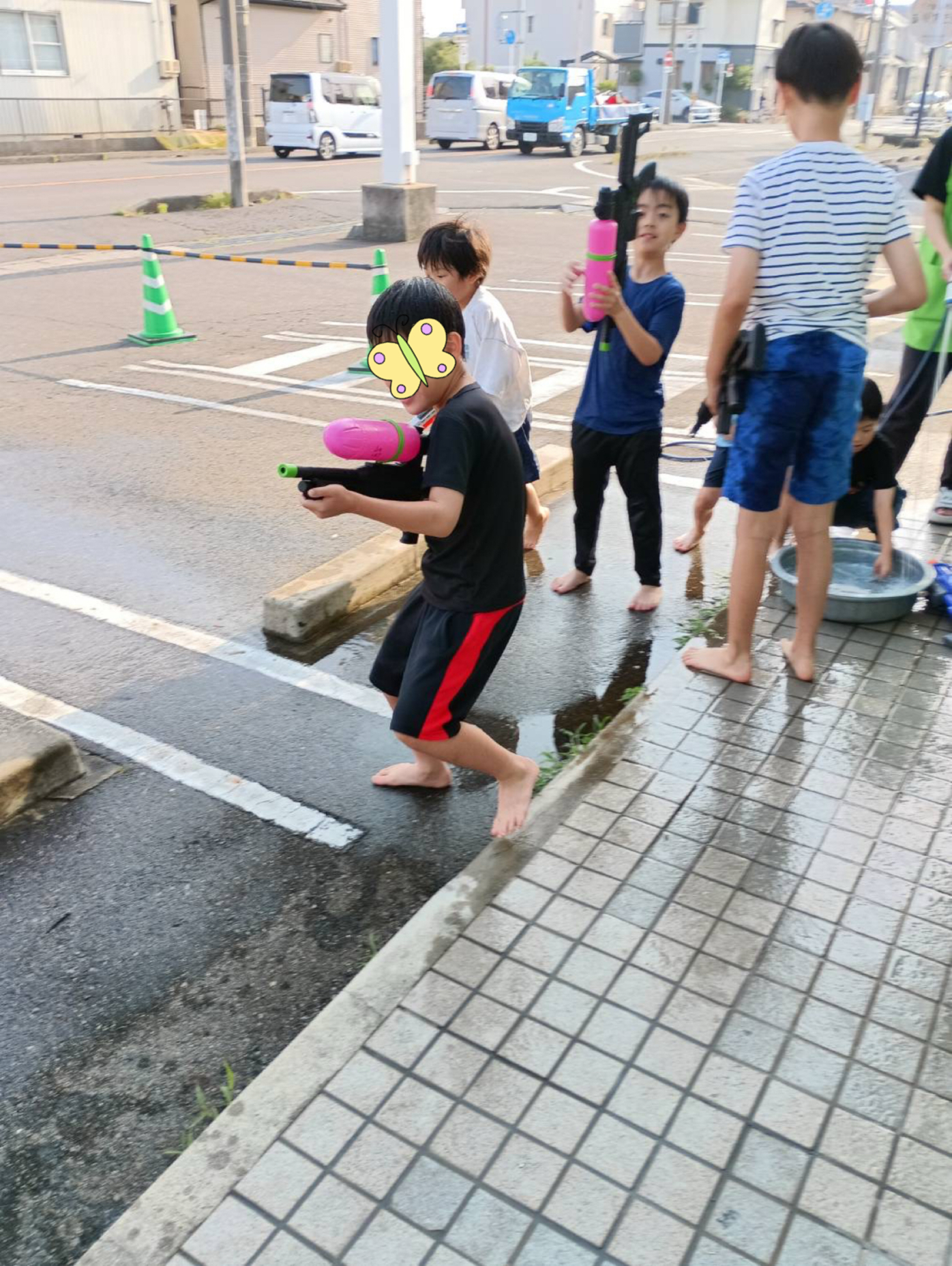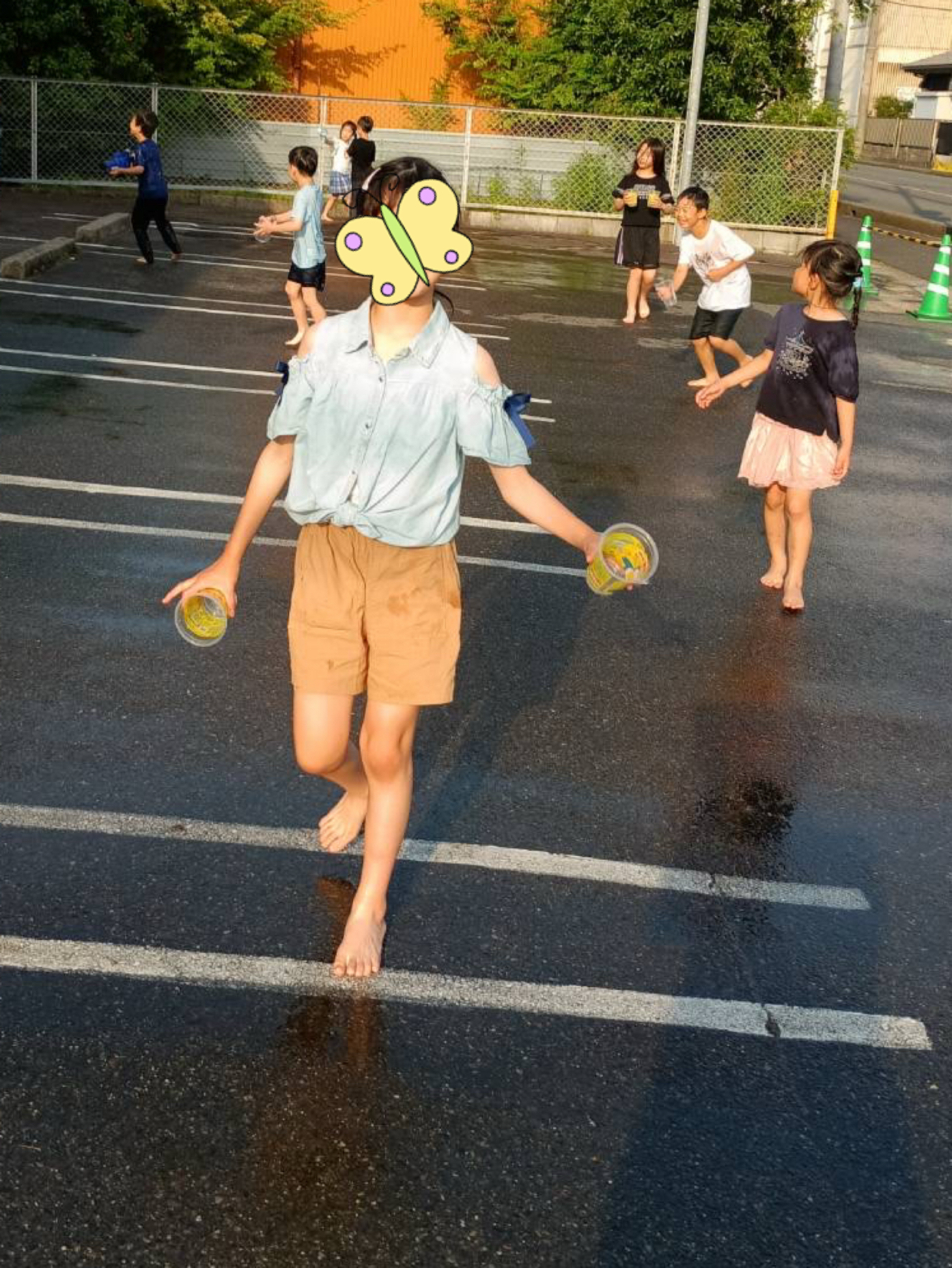 水鉄砲や、カップのお水をお友だちと楽しそうにかけ合いながら