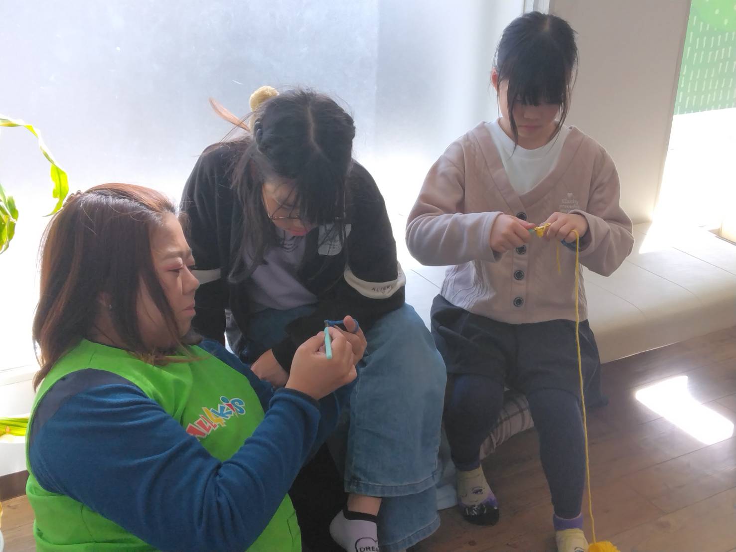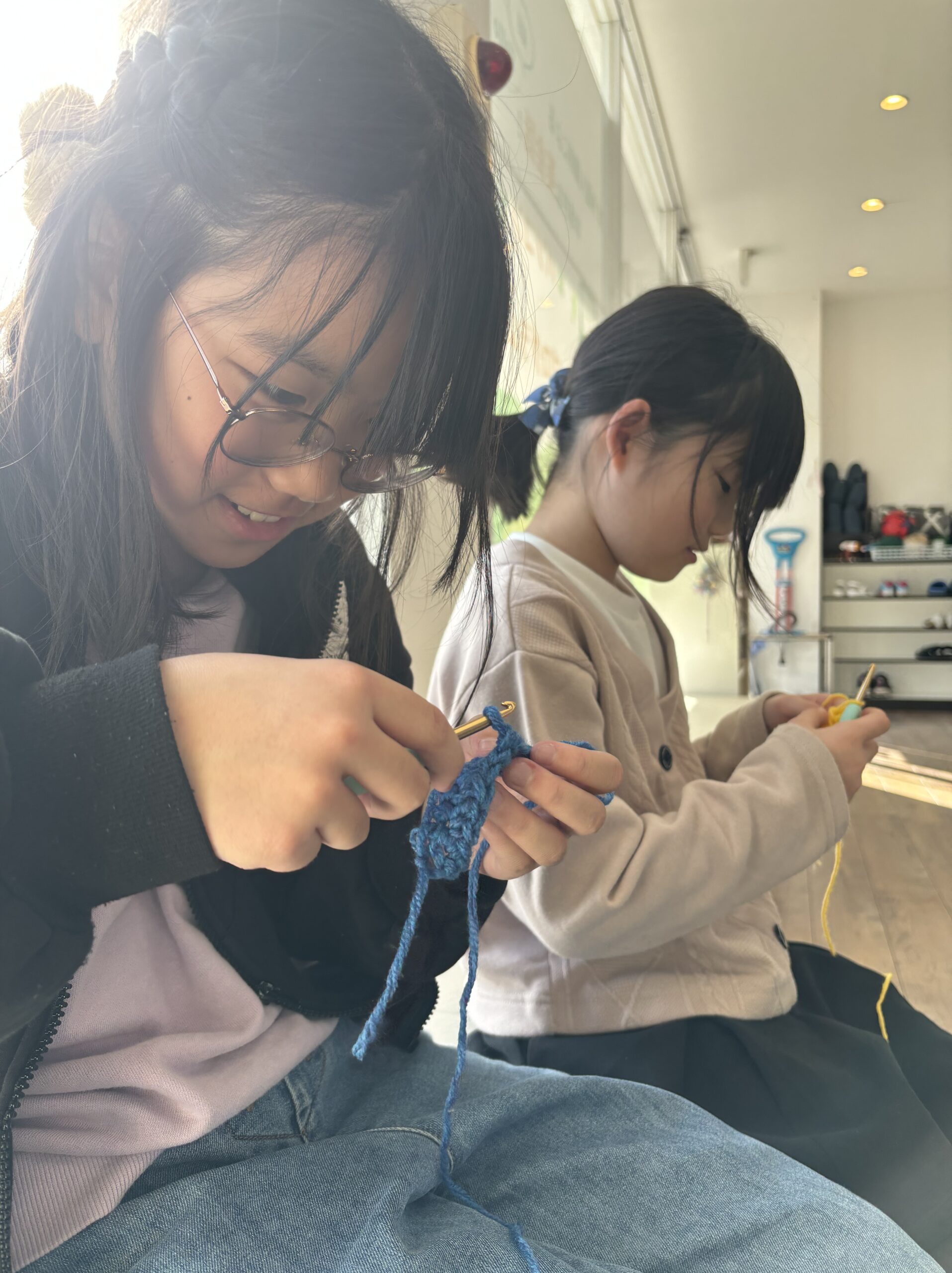 陽の当たる暖かいソファでは女の子たちが先生に編み物🧶を教えて貰っていましたよ。