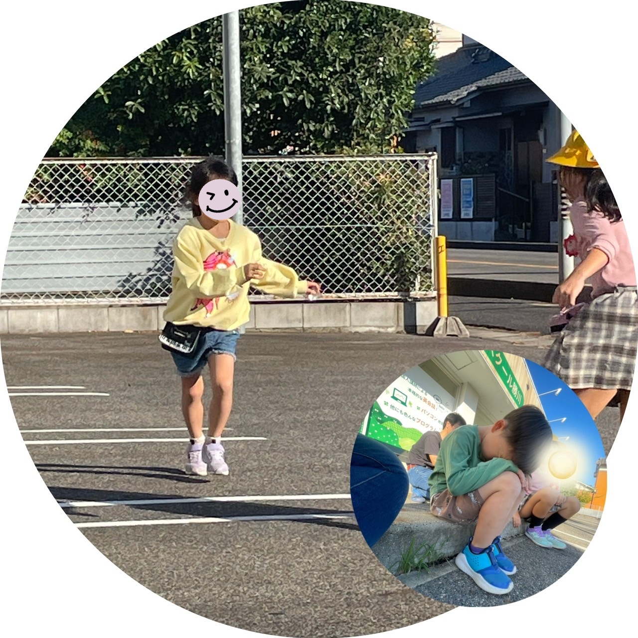 一年生は少し早く帰って来たので、駐車場で遊んでいました。