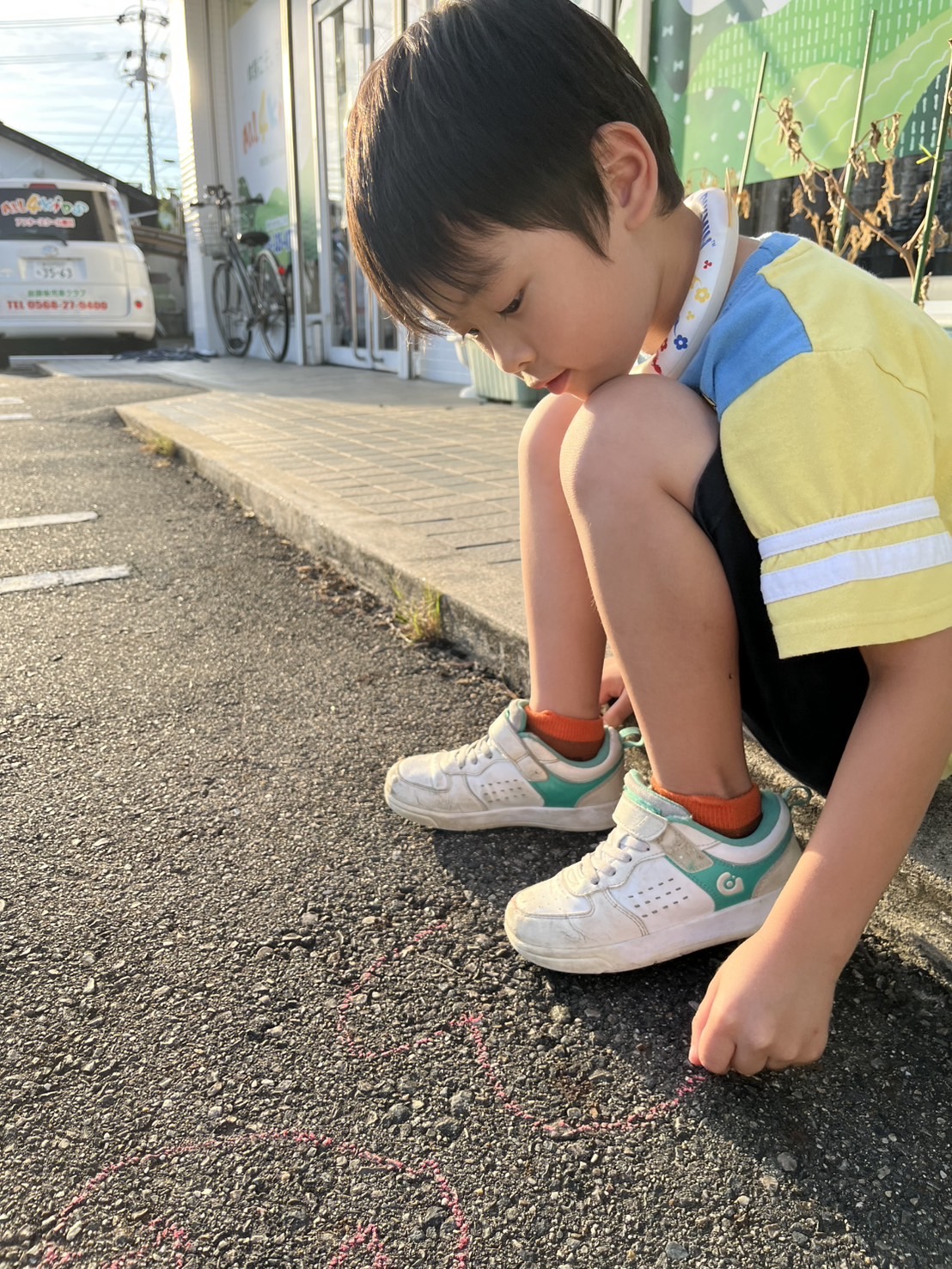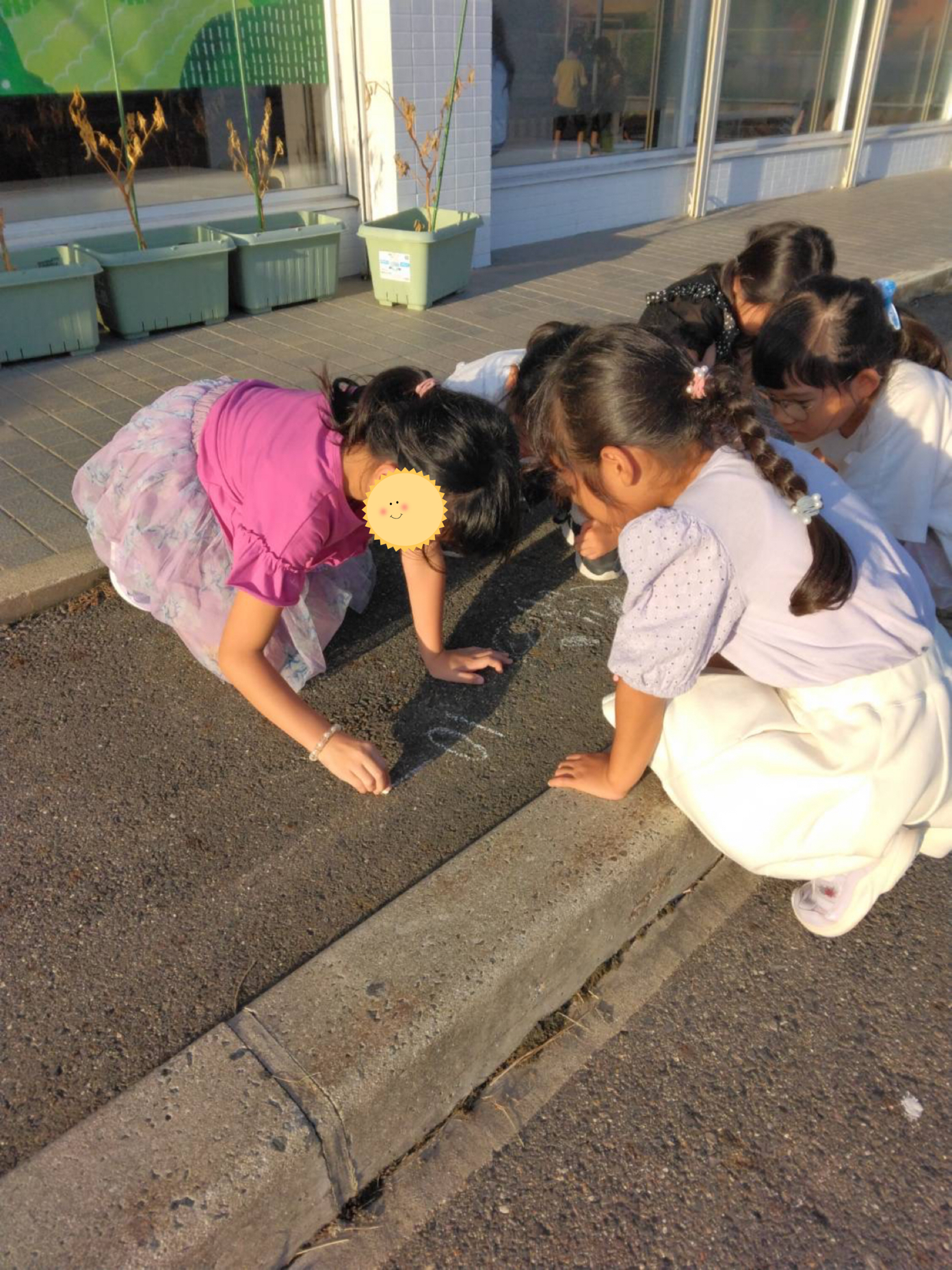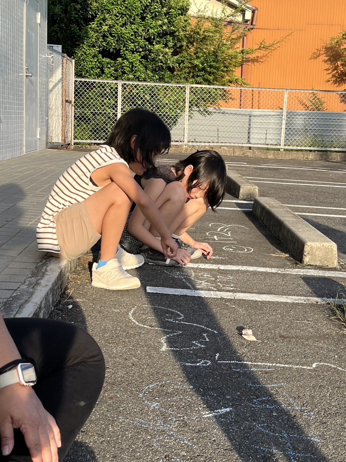 初めてチョークを持つ子も居ました‼️地面にみんなで思い思いの絵や字を書いていて、