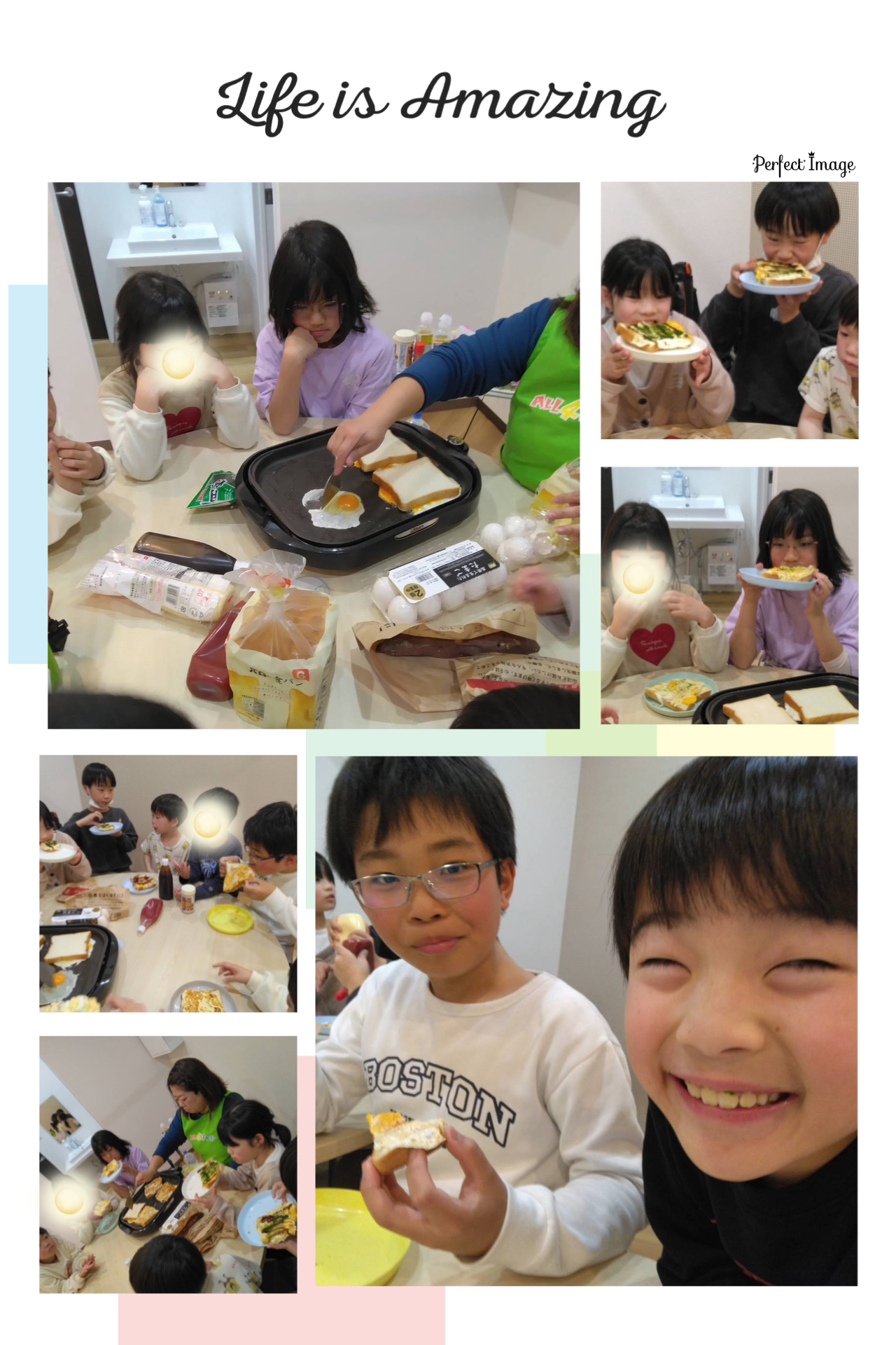 本日は、卵に食パンをつけて焼き、ソースやマヨネーズ、青のりなどもかけて食べました。