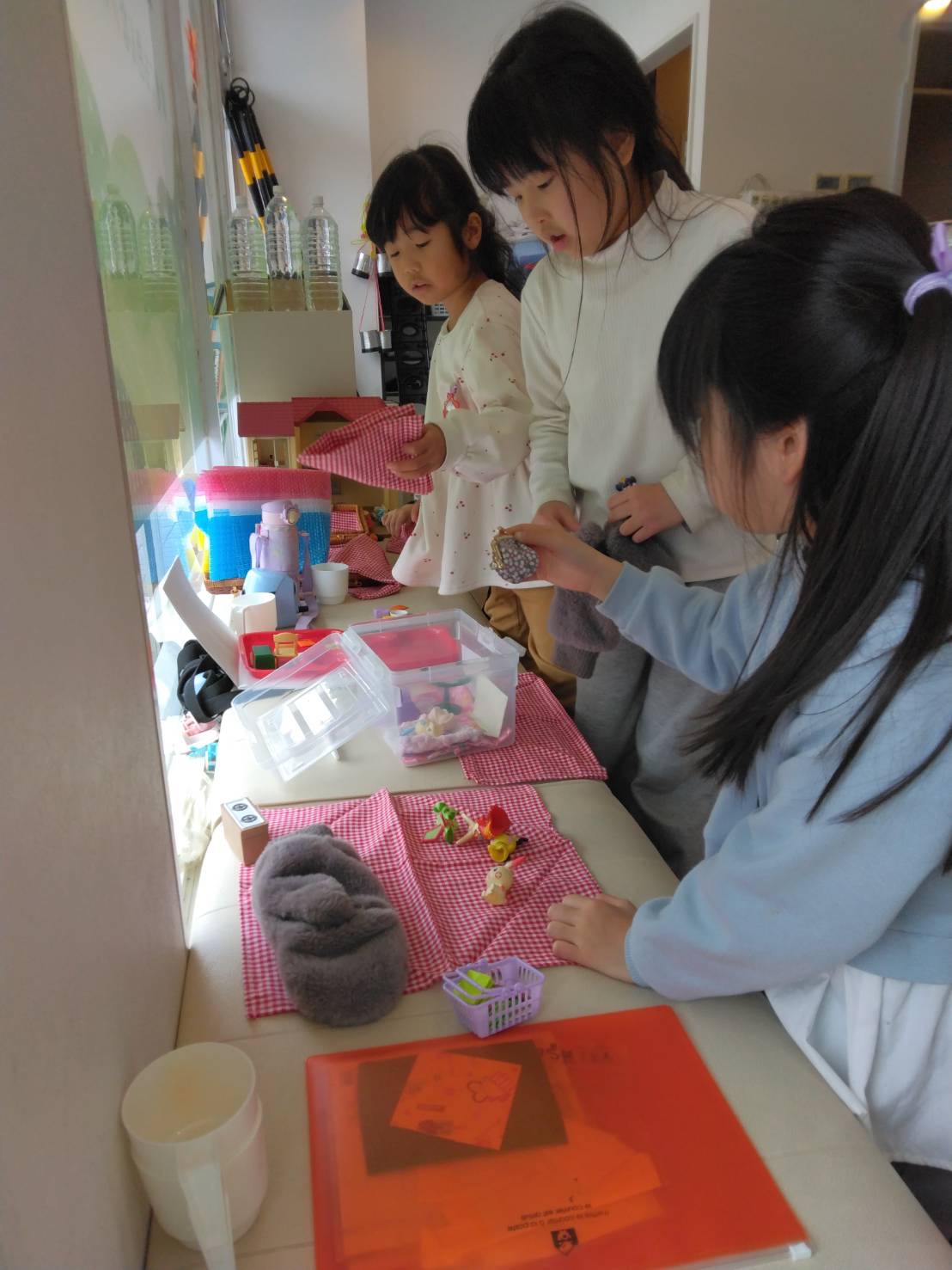 こちらの女の子たちはお人形やピクニックセットを広げておままごと