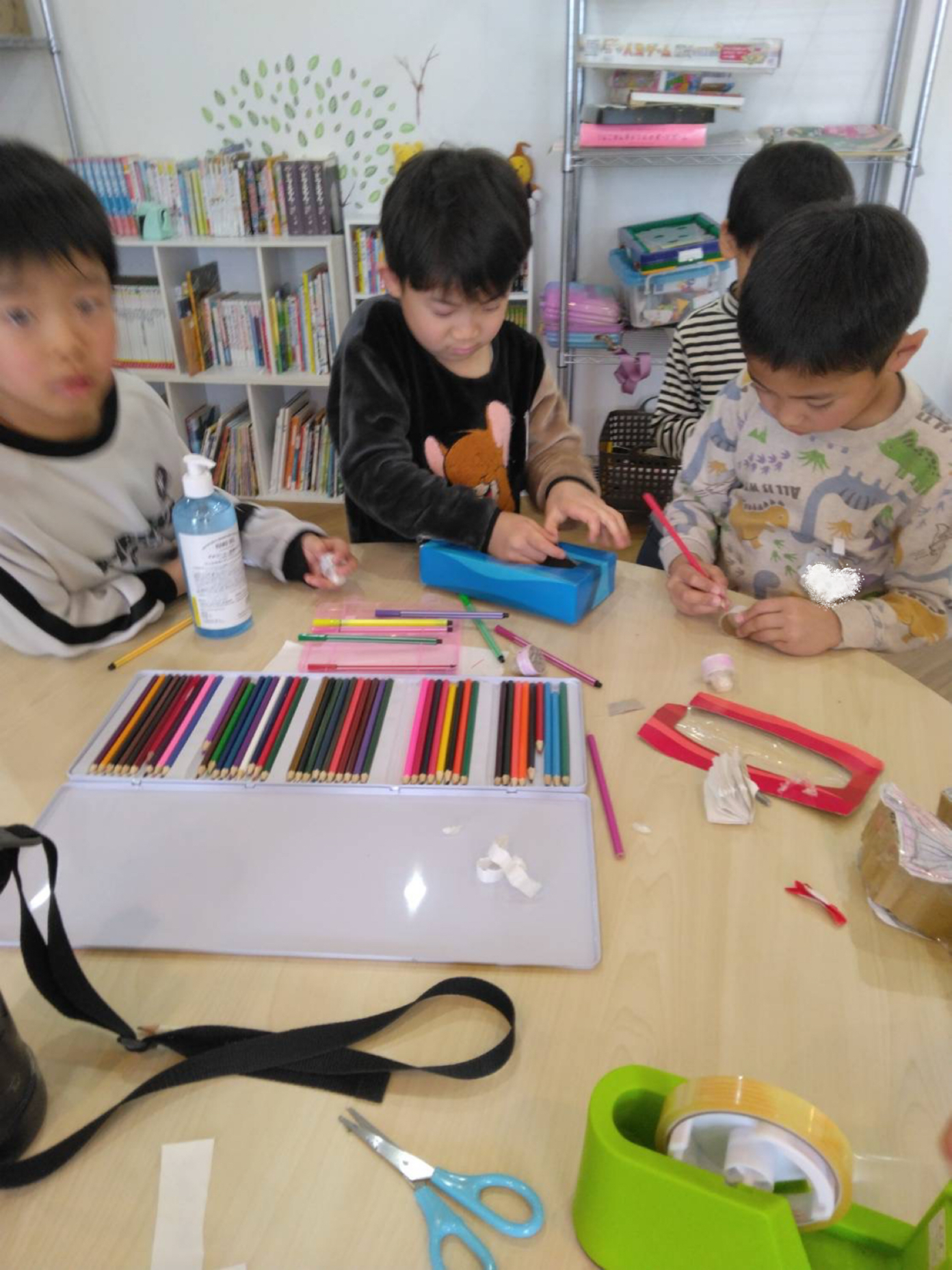 テーブルでは、男の子たちがお友だちと相談しながら工作を初めていました