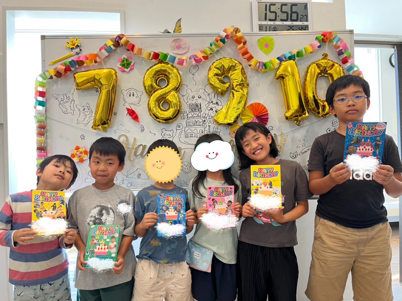 今日は10月生まれのお友だちのお誕生会です! 仲良しのお友だちをお祝いするために、子どもたちが自主的に飾り付けをお手伝いしてくれました🎀 「○○ちゃんが好きだって言ってたから、すみっこぐらしをたくさん描いてあげよっと🩷」 みんなのおかげで、とても賑やかな飾り付けが完成です! と言う事で、楽しいお誕生日会の始まりじはじまり〜🎉 今月は7歳から10歳のお……