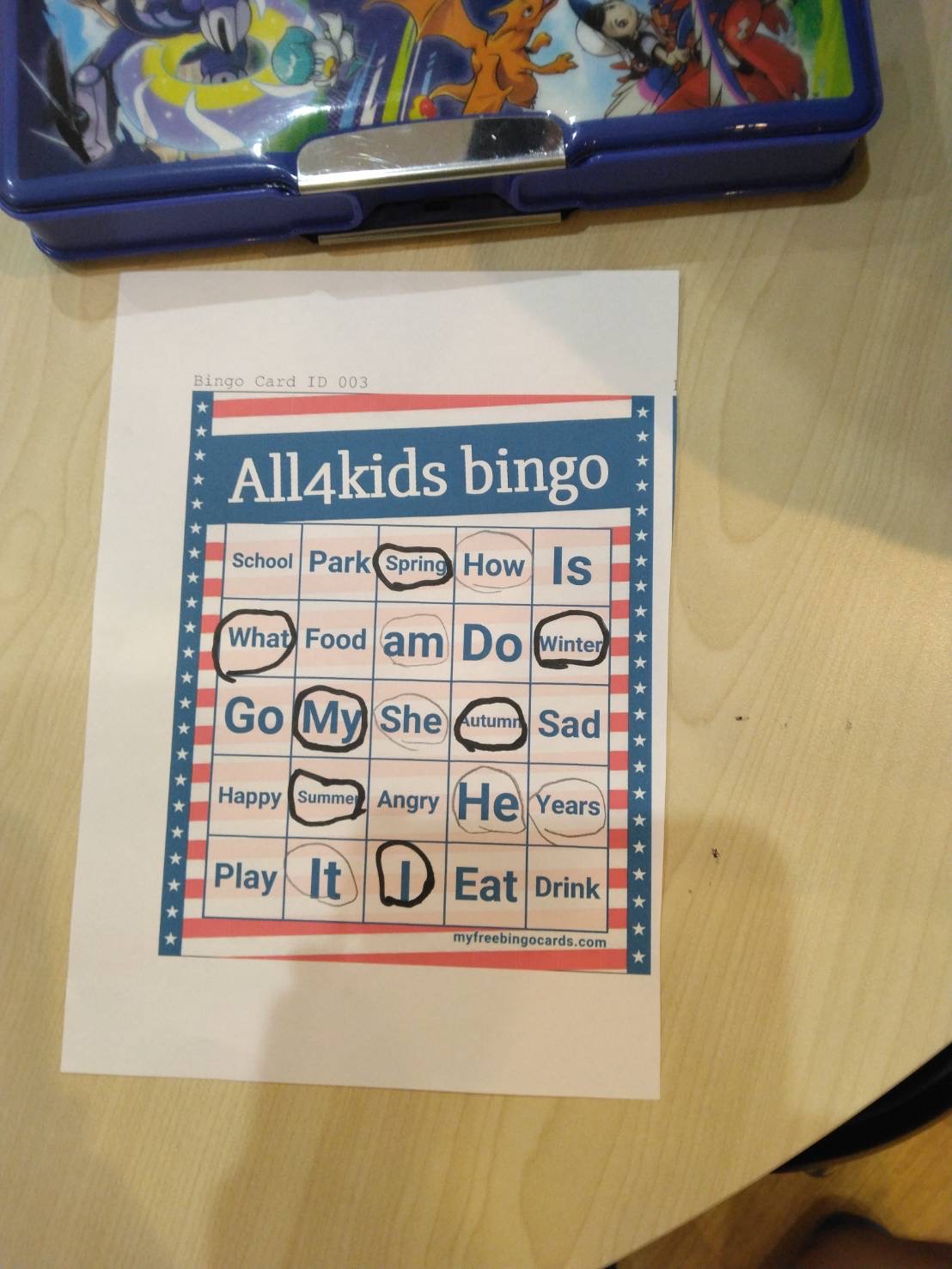 お盆期間中ということもあって、本日はとっても少人数でしたが それはそれでアットホームで楽しそうな様子の子ども達😊 朝のイングリッシュタイムでは、いつものように前に出て答えます。 そしてこちら‼️スバ先生お手製のALL4 BINNGOです。 とっても楽しそうですよね✨ 単語のスペルが分かっているのかどうか…という感じもありましたが、大盛り上がり……