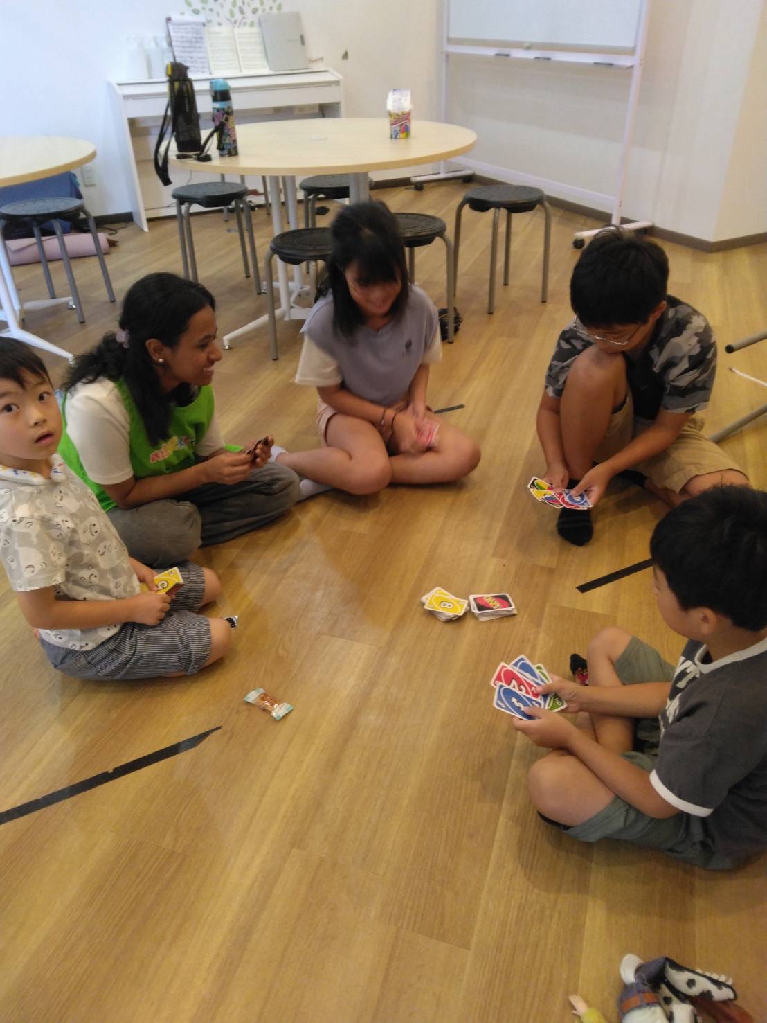 お盆休み明け、また久しぶりの出校日だった月曜日。 みんな会えた事が嬉しそうでした。早く遊びたくて、誘い合う声が飛び交います。 先週から流行りはじめたUNOをまずは手始めに遊びます(笑) 一年生もすっかりルールを覚えて、楽しそうです。 それから……遊びが分かれていきました。 特にこちらの女の子たちは、会話がとって……