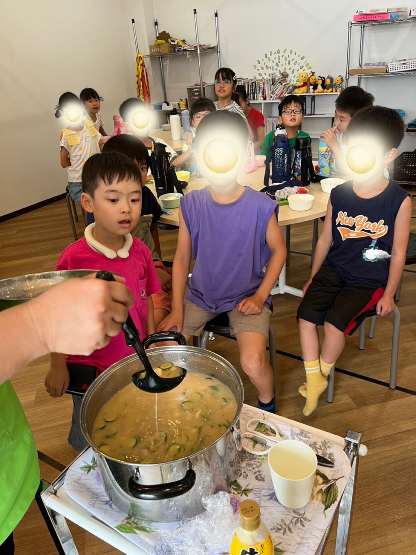 今日はおやつに宮崎県の郷土料理の「冷や汁」を作ってみました! まずはどの県の郷土料理なのかを子ども達に当てて貰ったのですが、高学年のお友達はもちろん低学年のお友だちからも色々な県名が次々に出て来てビックリ😳 正解が出たところで、「冷や汁」がどんな食べ物なのかを先生から教えて貰うと、子ども達もお鍋の中に興味津々の様子👀 ご飯に冷や汁をかけたら「いただきま〜す😋」 ……