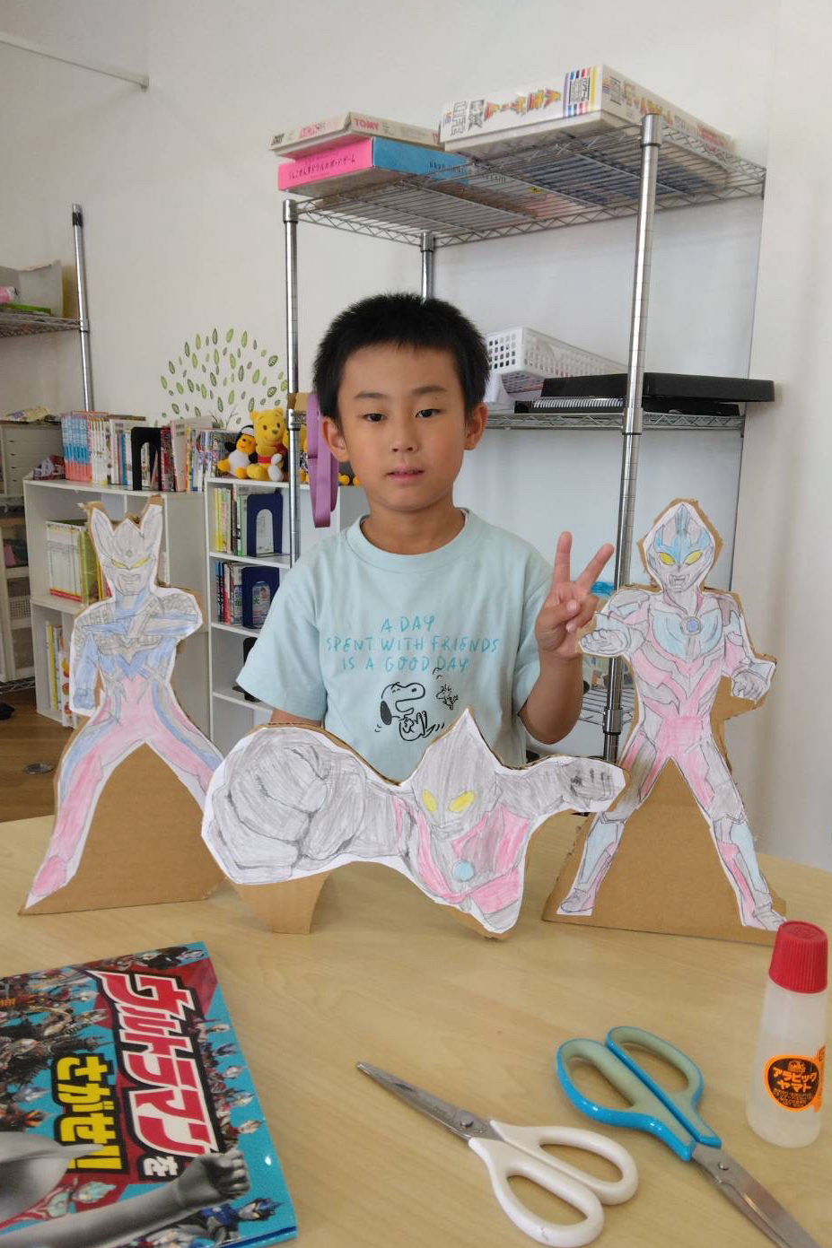 「先生!僕の大好きなご本📕持ってきたから見せてあげる!」 と嬉しそうに見せてくれたのはウルトラマンの本でした😊 「オレが一番好きなのはウルトラマンギンガ!」 「ウルトラマンゼロも好きだよ」 と言う事で、今日はウルトラマンの工作に挑戦です✂️ 見て下さい、この真剣な表情を!😊 細かい体のラインも、はみ出さない様に塗っています🖍️ のりを貼る時は絵が……