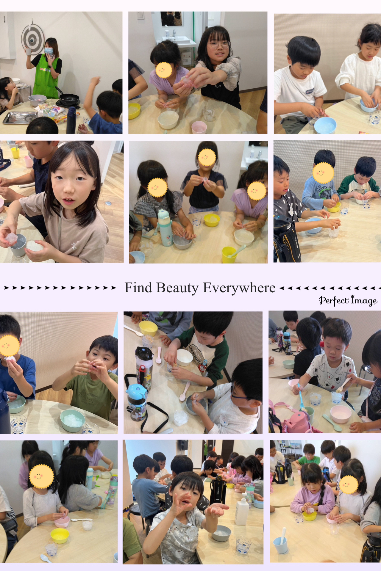金曜日‼️金曜日‼️ 今日はクッキングをしましたよ🎶 メニューは、『わらび餅』でした。 材料;片栗粉、砂糖、水、きな粉 ①水に片栗粉と砂糖を混ぜ、火にかける(混ぜるのを止めない) ②段々固まってくるので、固い感覚をかんじたえら、氷水へ‼️ ③固まりを手でちぎってきな粉をかけて出来上がり‼️ 個人で、器にちぎって入れました。 きな粉を……