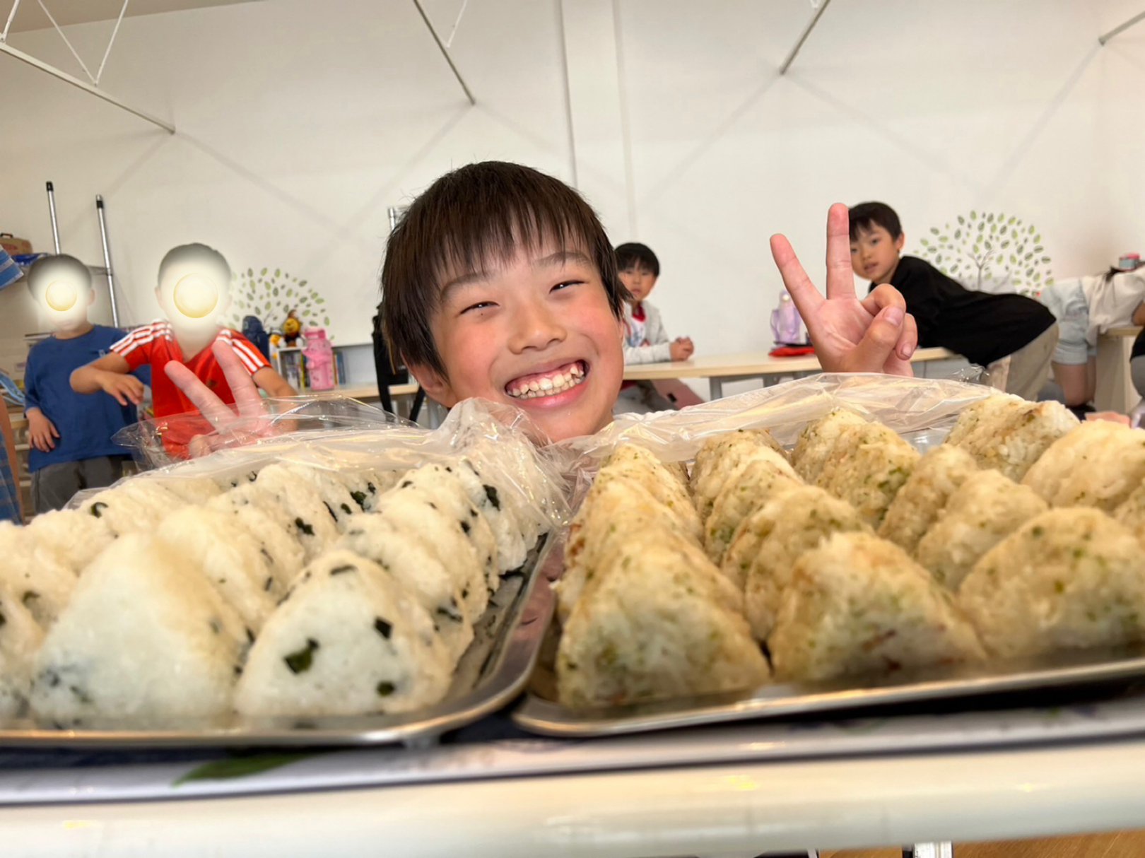 今日はご機嫌の1年生から始まりますよ〜(笑) 手を洗いがてら、鏡に映る姿に大好きなお友だちとイェイイェイ✊✊ 4月から仲間になったばかりでも、こんなに仲良しです。 子どもたちから『今日のおやつなぁに??』の質問に、『悪魔👿のおにぎり🍙だよ!』と伝えると、 ちょっぴり不安げな1年生も…(笑) そう、お馴染みの天かす&青のり&麺つゆのあのおにぎりです🍙 ……