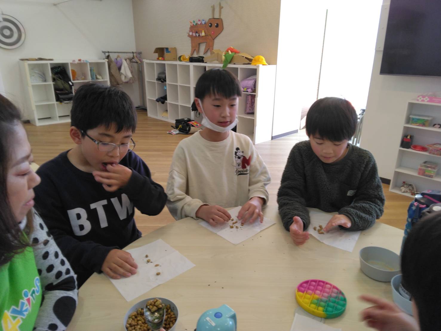 「宿題済ませたら、何して遊ぶ?」 「ドッジボール🏀やろうよ!」 などと楽しそうに、お話をしながら宿題に取り組む子供たちです。 一年生は、仲良くブロック遊びやお絵描きをしていましたよ。 「そうだ!おれ、きな粉作るんだった!」と三年生の男の子が節分豆を細かく砕いて、きな粉作りを始めると、「やりたい!やりたい!」と他のお友達も集まって来ました。 交……