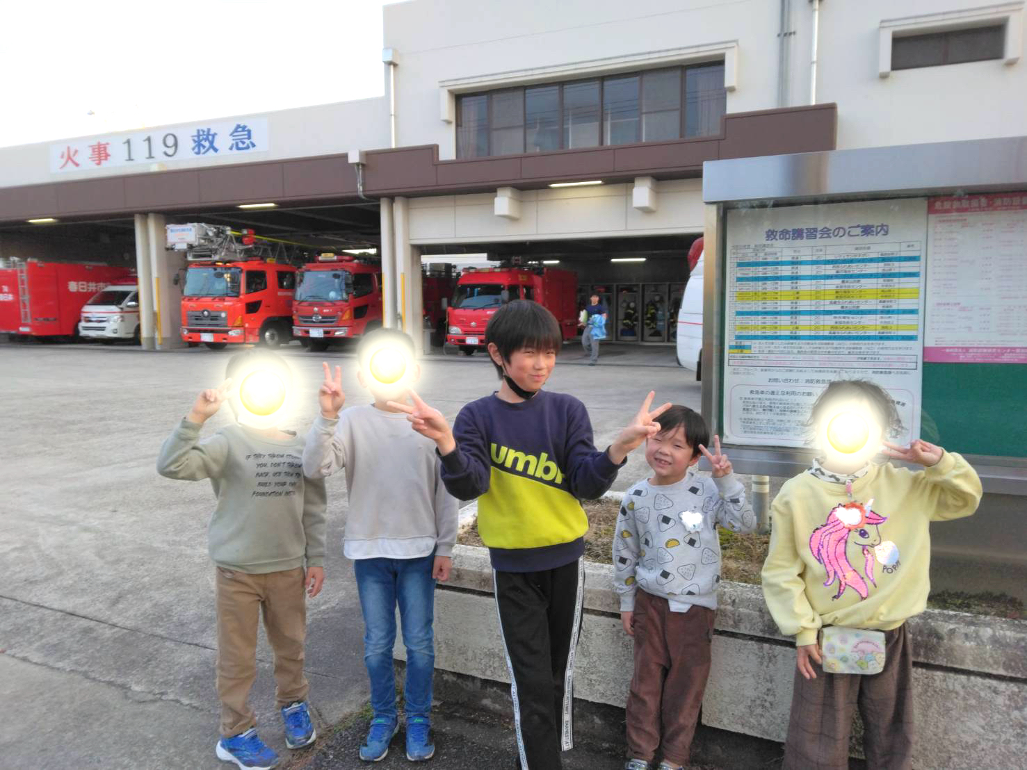 昨日までの雨も上がって、穏やかな週の始まりになりましたね! いつも通り宿題とおやつを食べた後は日課のイングリッシュタイムですよ!🇬🇧 ペアで「What did you do on the weekend?」とお互いに質問したり、 「I ate rice cake !」とお餅を食べた事を答えているお友だちもいましたよ‼️ その後は散歩に出て、消防署の前で記念……