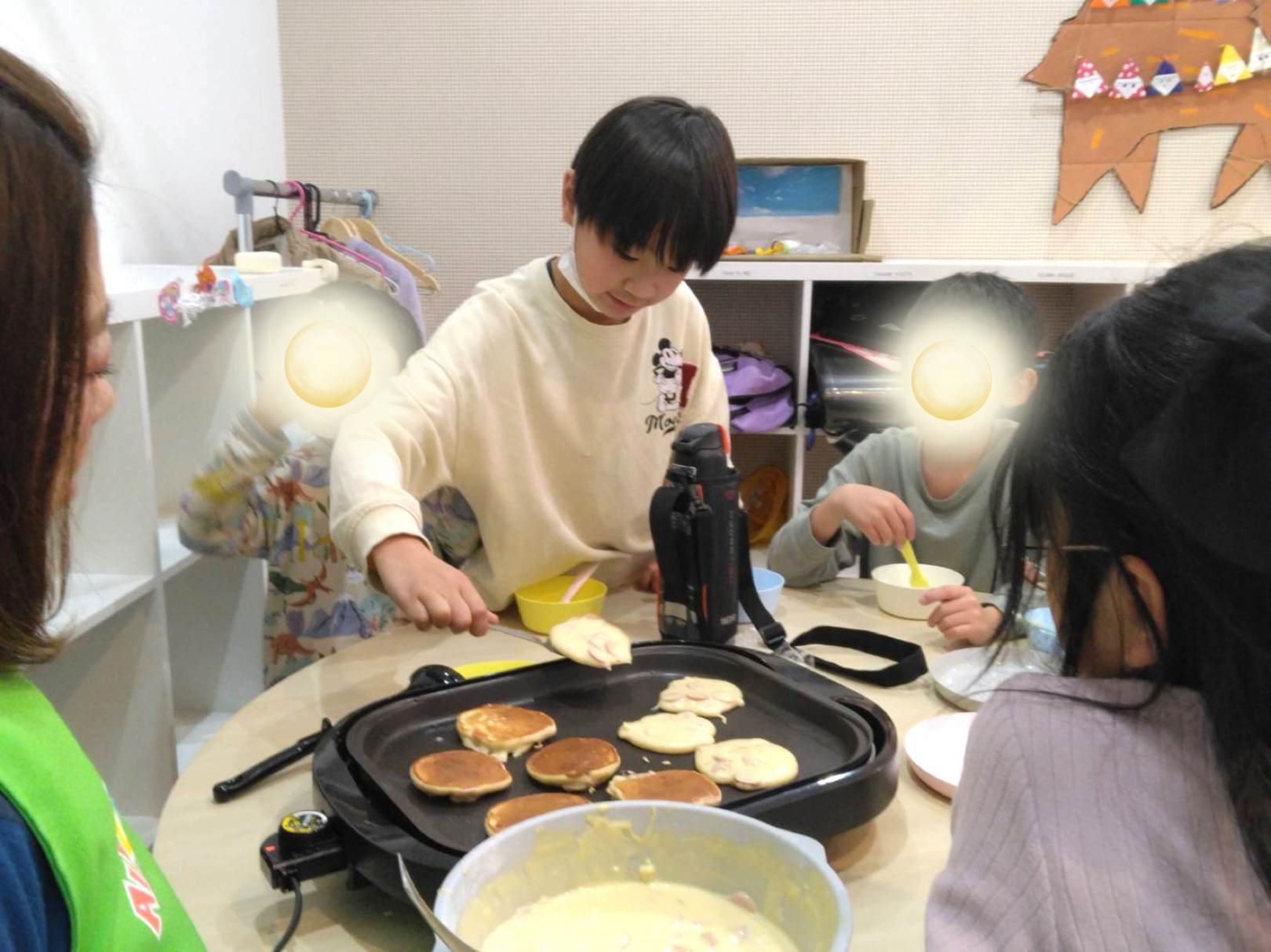 「先生、ただいま〜!」っと元気に帰った後は、「宿題やりたくないな〜」なんて、言いながらも、すぐに宿題に取り組む子供たちです!😆 3年生が宿題をしている間、一年生は寝転んで、仲良く遊んでいましたよ! 今日はおやつにALL4オリジナルの「ウインナーホットケーキ」を作りました! 「先生、ひっくり返すのやりたい‼️」 と言うので、返すのを手伝って貰……