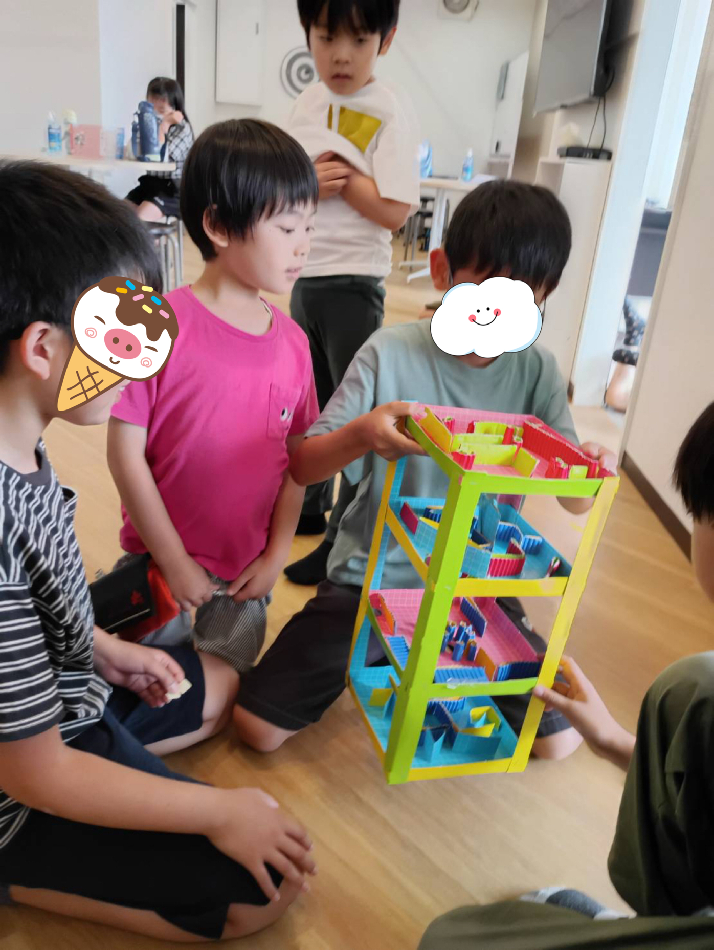 高学年のお友だちが「ただいま!」と帰ってくると お部屋の中はとっても美味しそうな香り🤭 そう、今日はおやつに焼肉のタレおにぎりを焼いていたのでした🍙 香ばしく焼けたおにぎりは大好評😆 今日もみんながたくさんおかわりをしてくれて、 先生はとても嬉しかったですよ😊 おやつの後のこと お友だちが学校で作った立体迷路に人だかりが ……