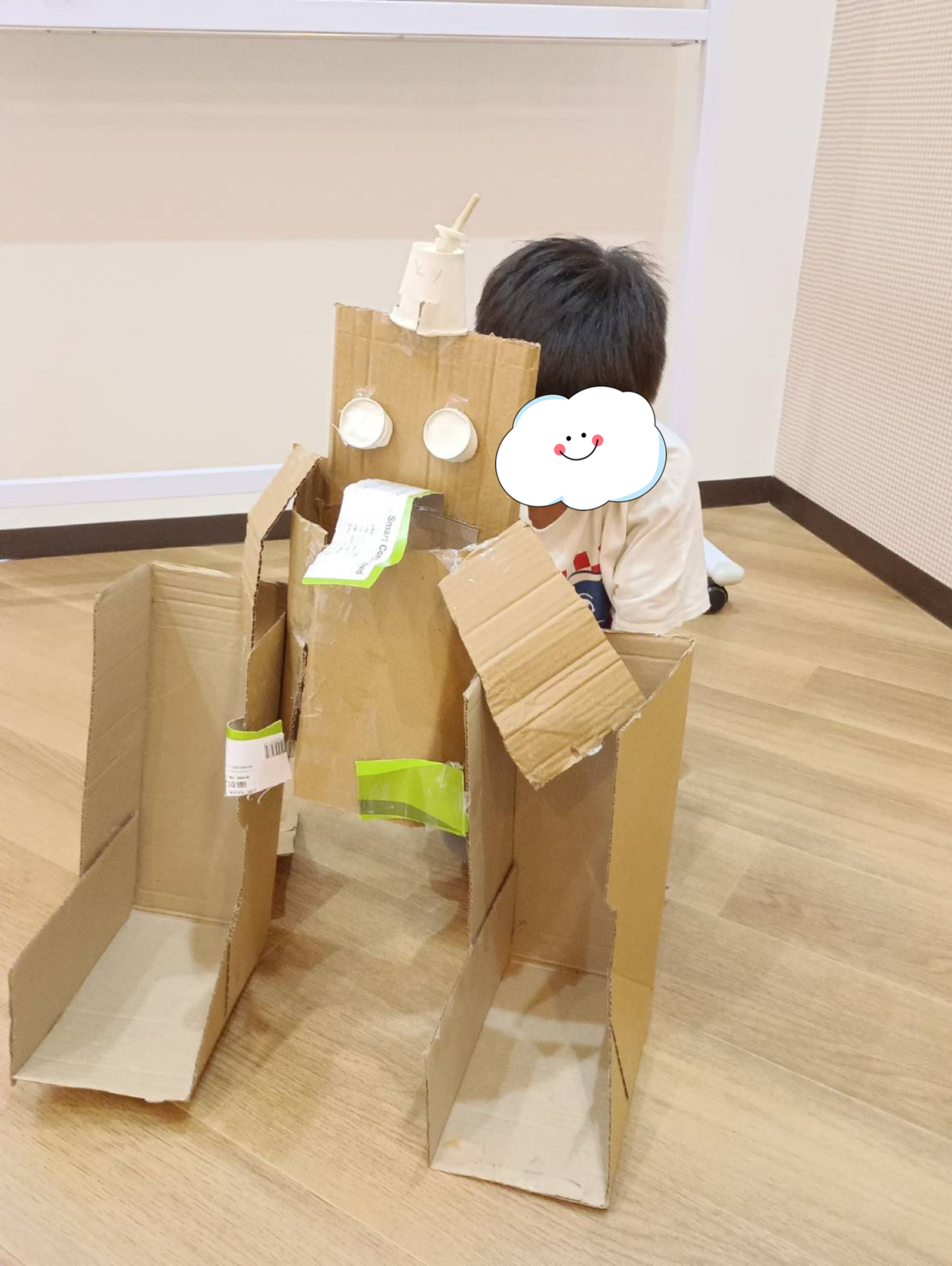 子ども達が学校から帰ってくる頃には ポツポツと雨が…☂️ と、言うことでおやつを食べたあとは お部屋の中で楽しく過ごすことに こちらの男の子たちはダンボールでロボットや、 バスケットゴールを製作中✂️ お友だちと 「ここにコレくっつけたら?」 と、相談しながら仲良く工作を楽しんでいました😊 ……