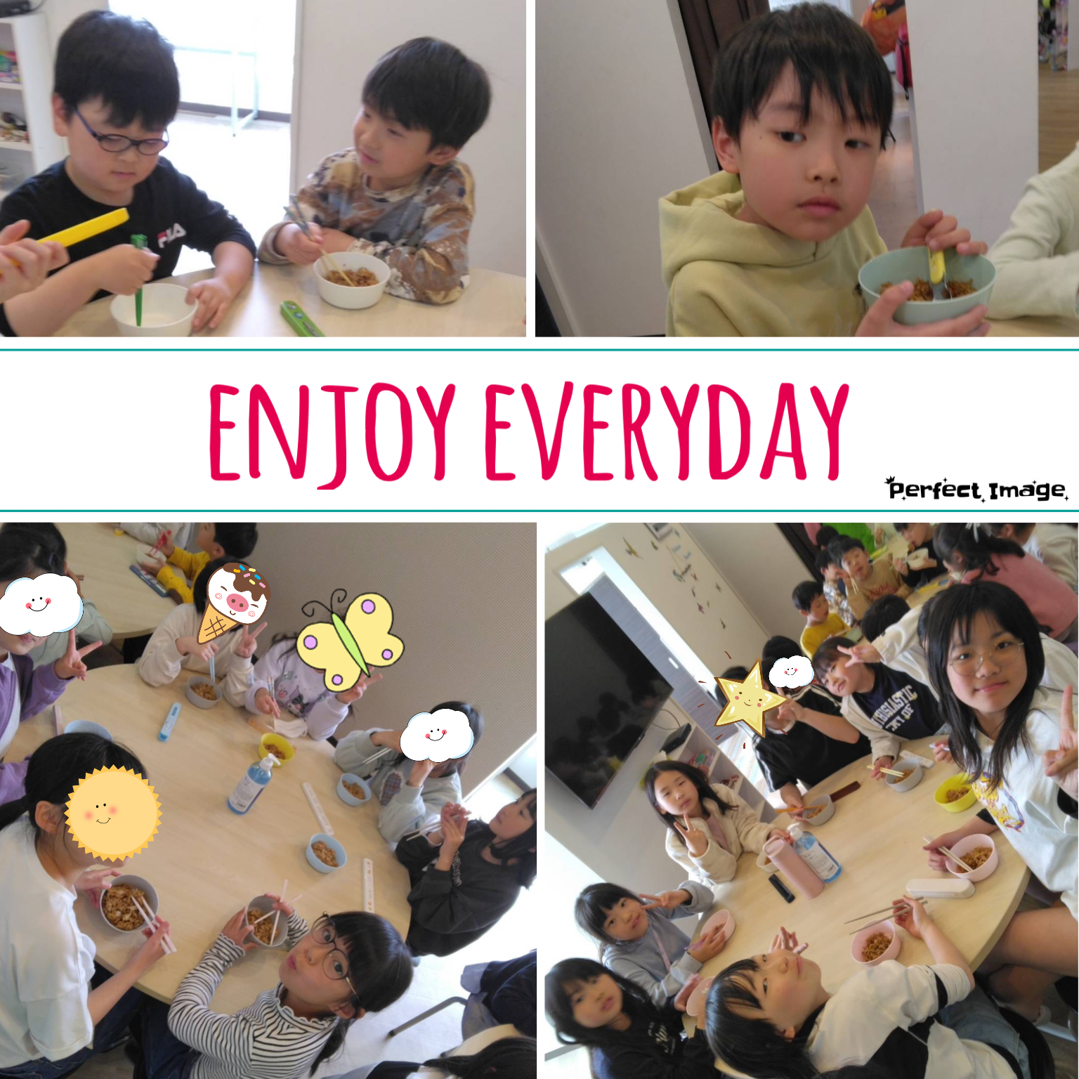 今日は6時間授業のお友だちもいたので、 宿題を済ませると、すぐにおやつの時間に🕒 今日は若菜と梅しそ、海のめぐみなど 3種類の味のおにぎりを用意してみました🍙 お腹を空かせて帰って来た子供達には おにぎりが大好評。 今日もラップにくるんだおにぎりを 自分の好きな形に握って 美味しくいただきました😋 おやつの後は、イング……