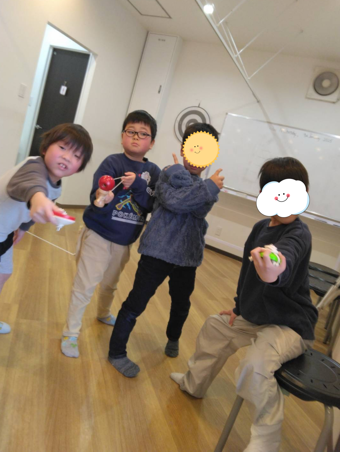 今日は冷たい風が吹いてとても寒い一日でしたね。 学校からの帰り道に「先生、今日ね、雪が降ってたよ!」と教えてくれたお友だちもいました❄️ いつものように宿題を済ませた子供達に先生からささやかなサプライズが😳 それは何だったかと言うと… 新しくコマとけん玉を買ってきました! 子ども達は目をキラキラさせながら、さっそくけん玉とコマ回しにチャレンジ! ……