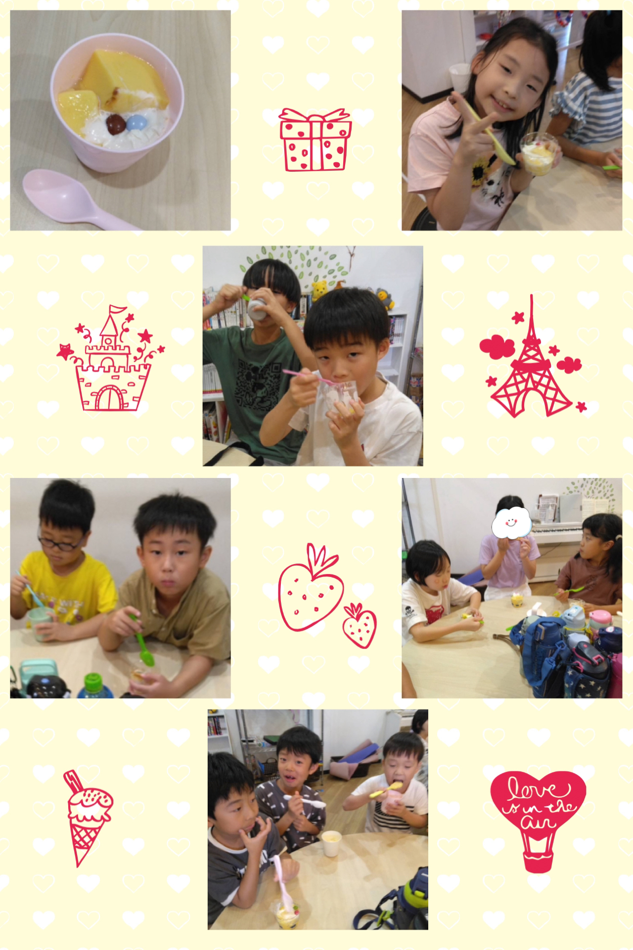 その後はみんなでハッピーバースデーを歌ってお祝いをしたあと、みんなでマーブルチョコと生クリームでデコレーションした美味しいプリンをいただきました🍮