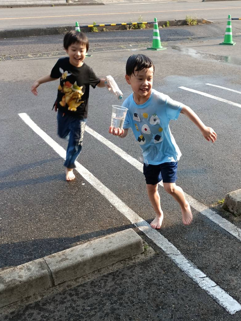 今日はとても暑かったので、 おやつの後は駐車場で水遊びをすることに 初めは冷たい水を触って遊んでいるだけだった子ども達も 水鉄砲や、カップのお水をお友だちと楽しそうにかけ合いながら 「気持ちいい😊」 と大喜びで遊んでいました。 これからも暑い日には水遊びをして遊びたいと思いますので お着替えを持ってきて下さいね😊 ……