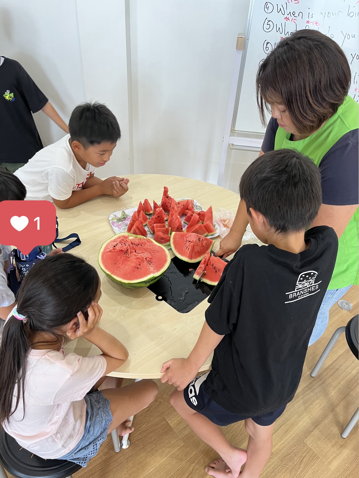 今日はお弁当の後みんなでスイカ割りをしました(о´∀`о) じゃんけんで順番決め! 「もうちょっと右!!」 「行き過ぎ!戻って!」 と周りからヒントをもらっても中々当たらず… 力が強い男の子が2回ほど叩いてしっかり割れていました⭐︎ 早く食べたくて待ちきれない 楽しくて美味しい夏の思い出になったね⭐︎ ……