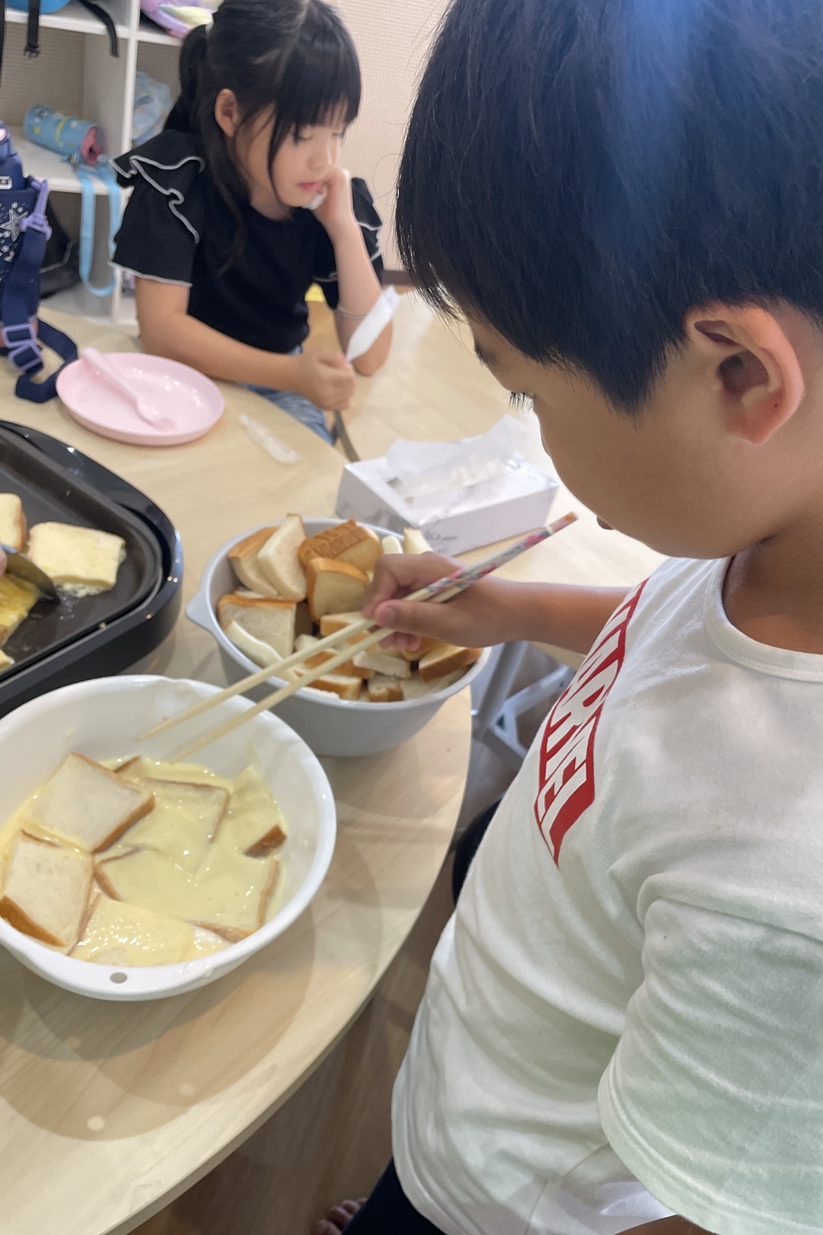今日のアフタースクールでは、いよいよ明日に控えた「お化け屋敷」の準備をみんなでしましたよ。 そして美味しい美味しいお弁当タイム~!! ママに作って貰ったお弁当は美味しいね!! 女の子達は先生と何やらお話中~! おやつは、こども達とフレンチトーストを作りました!美味しくてたくさん食べちゃいましたよ! ……