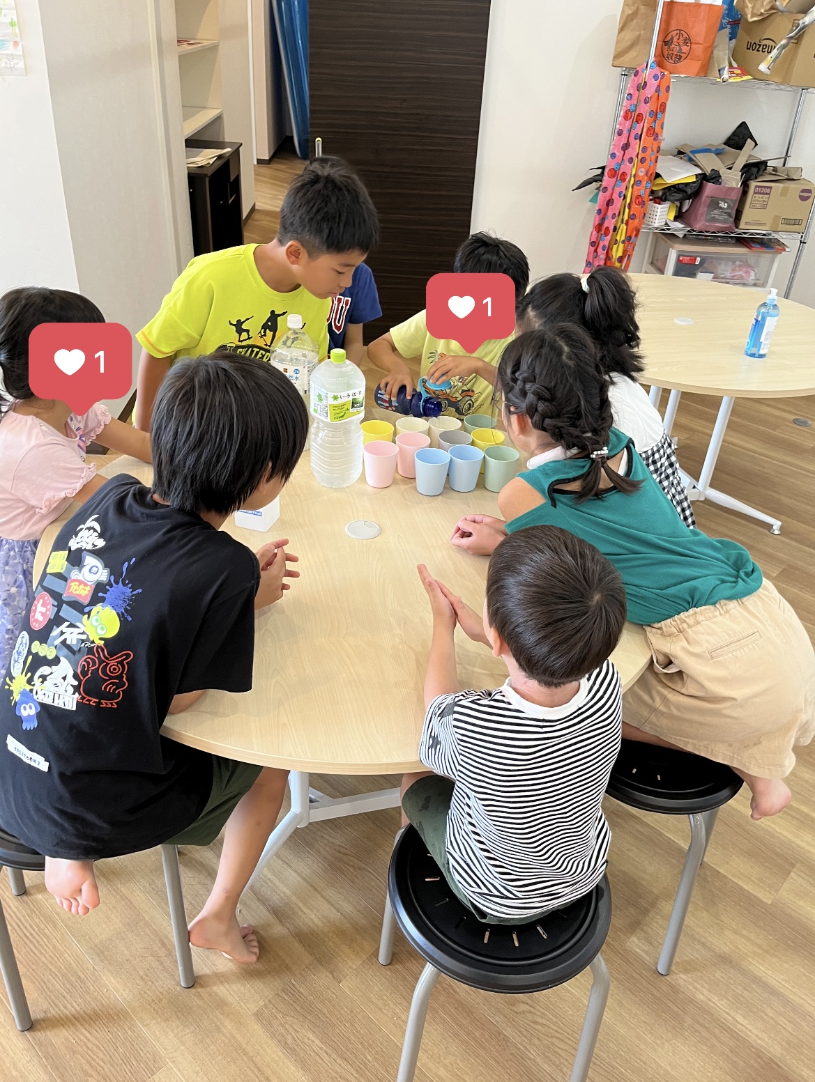 今日から一年生の男の子が仲間入りしました⭐︎ 名古屋市からきてくれているのでみんなは初めましてだね! これから楽しい思い出一緒に作りましょう(o^^o) 午前中に宿題を済ませてカルピスタイム 水で薄めたり炭酸でカルピスソーダにしたりと好きな飲み方で♪ からの暑いのでテレビでちょーっとだけ怖い話を見てからお昼ご飯!からの水遊び! 1時間ほど遊んで……