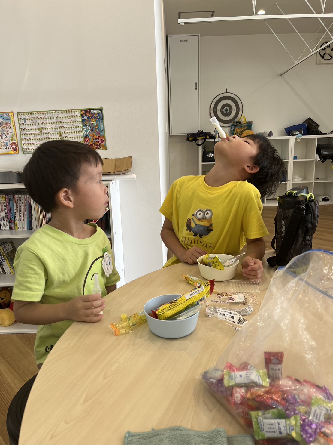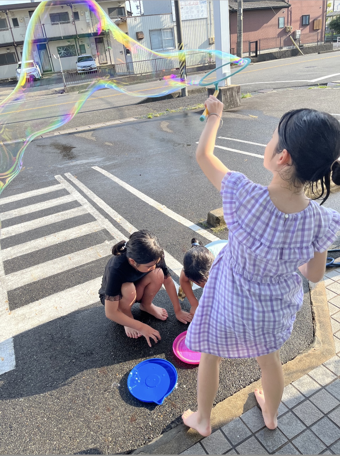 連休明け1日目はとーーーっても暑い… ので子供達は帰って来てすぐ水遊びしたい!と大騒ぎ笑 その前におやつとイングリッシュのお勉強! 今日は駄菓子多めで喜んでもらえました☆ 一生懸命取り組んでいます! 大きめのシャボン玉も手に入れて大喜び 風で割れやすいのだけが残念ですがとても楽しんでくれました☆ ……