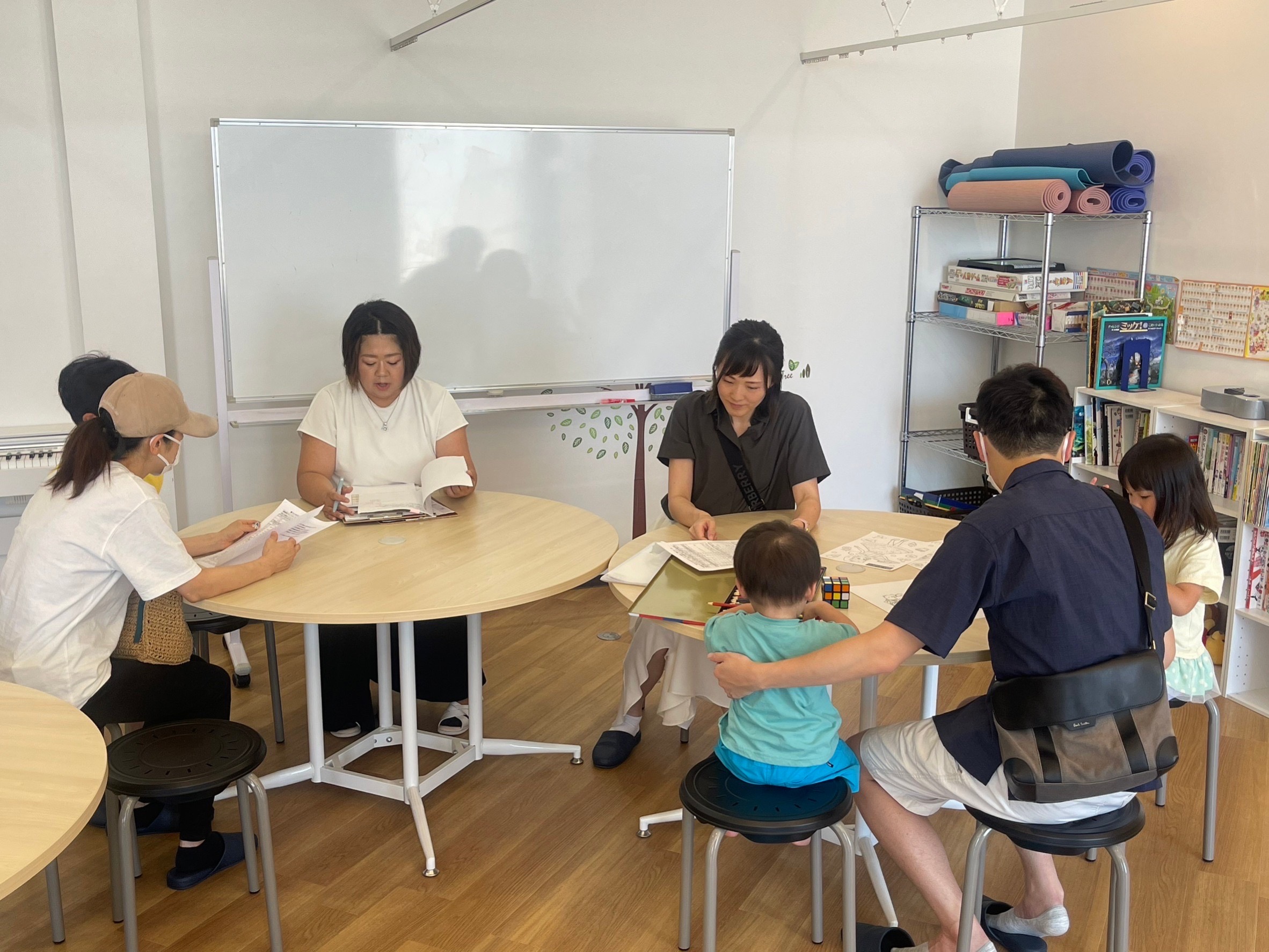 本日も暑い中、ナーサリー勝川から2組の方がお越し頂きました!! なんと!私(施設長 杉山)がオアシス21で七夕夏まつりで司会をしていたことを覚えていてくれました!!嬉しいです!!て(ง ᵕωᵕ)ว♪ 静かにお話している最中2人で遊んでいてくれました。 パパも後から来てくださいました。 そして最後、お帰りの前にはい!チーズ!! ……
