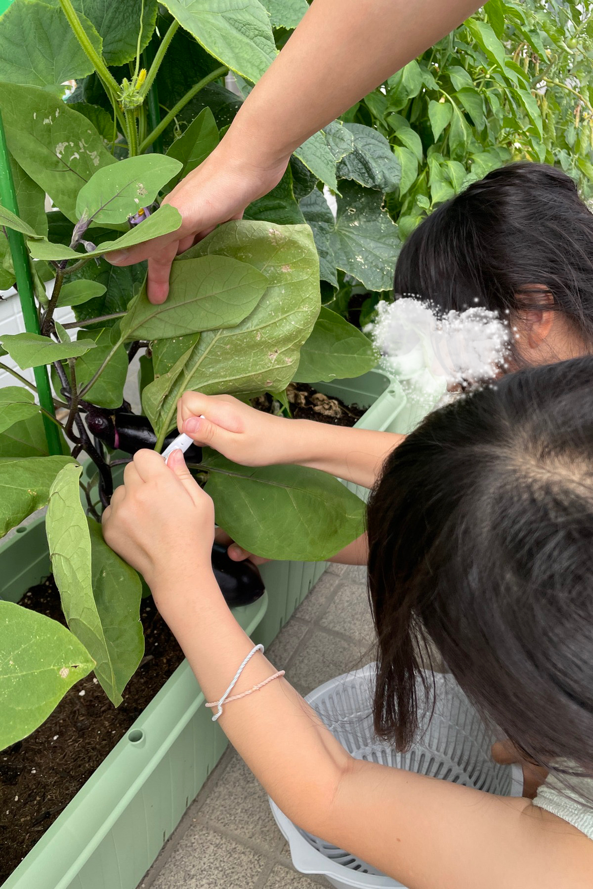 今日は実りに実ったナスを収穫しました!! まずは『どのナスを切る??』と選びましたよ。 『よし!これ!!』 ナスだけでなく、ピーマンとオクラも実っていました!! これらを今日は焼いておやつにします!! 食べる前は… ジョン先生のイングリッシュタイム!! 野菜は英語でvegetable ……
